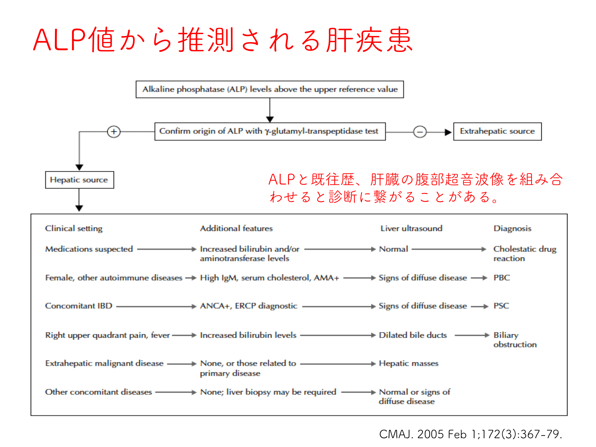 #13. ALP値から推測される肝疾患 ALPと既往歴、肝臓の腹部超音波像を組み合 わせると診断に繋がることがある。 CMAJ. 2005 Feb 1;172(3):367-79.