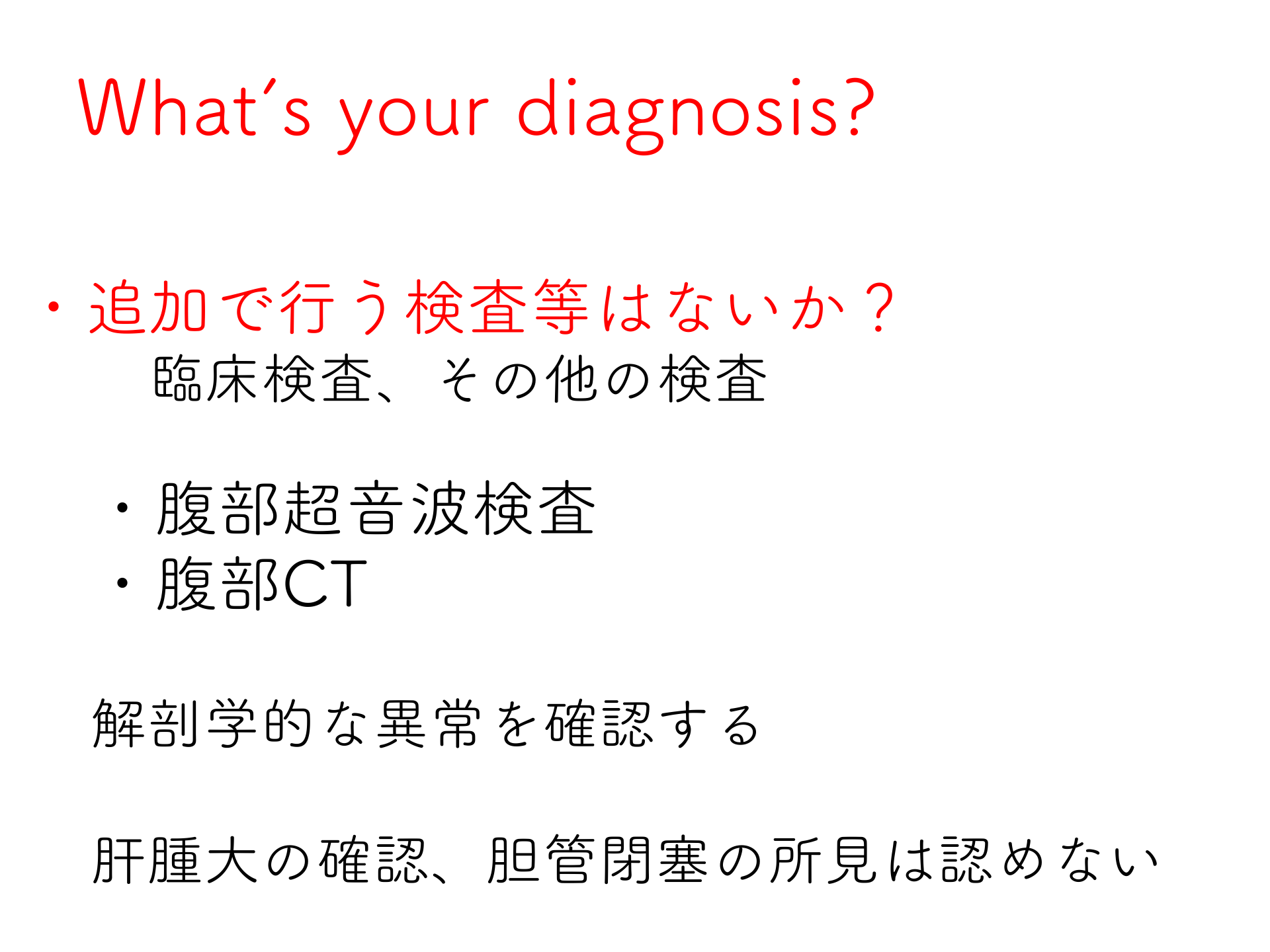 #14. What s your diagnosis? ・追加で行う検査等はないか? 臨床検査、その他の検査 ・腹部超音波検査 ・腹部CT 解剖学的な異常を確認する 肝腫大の確認、胆管閉塞の所見は認めない