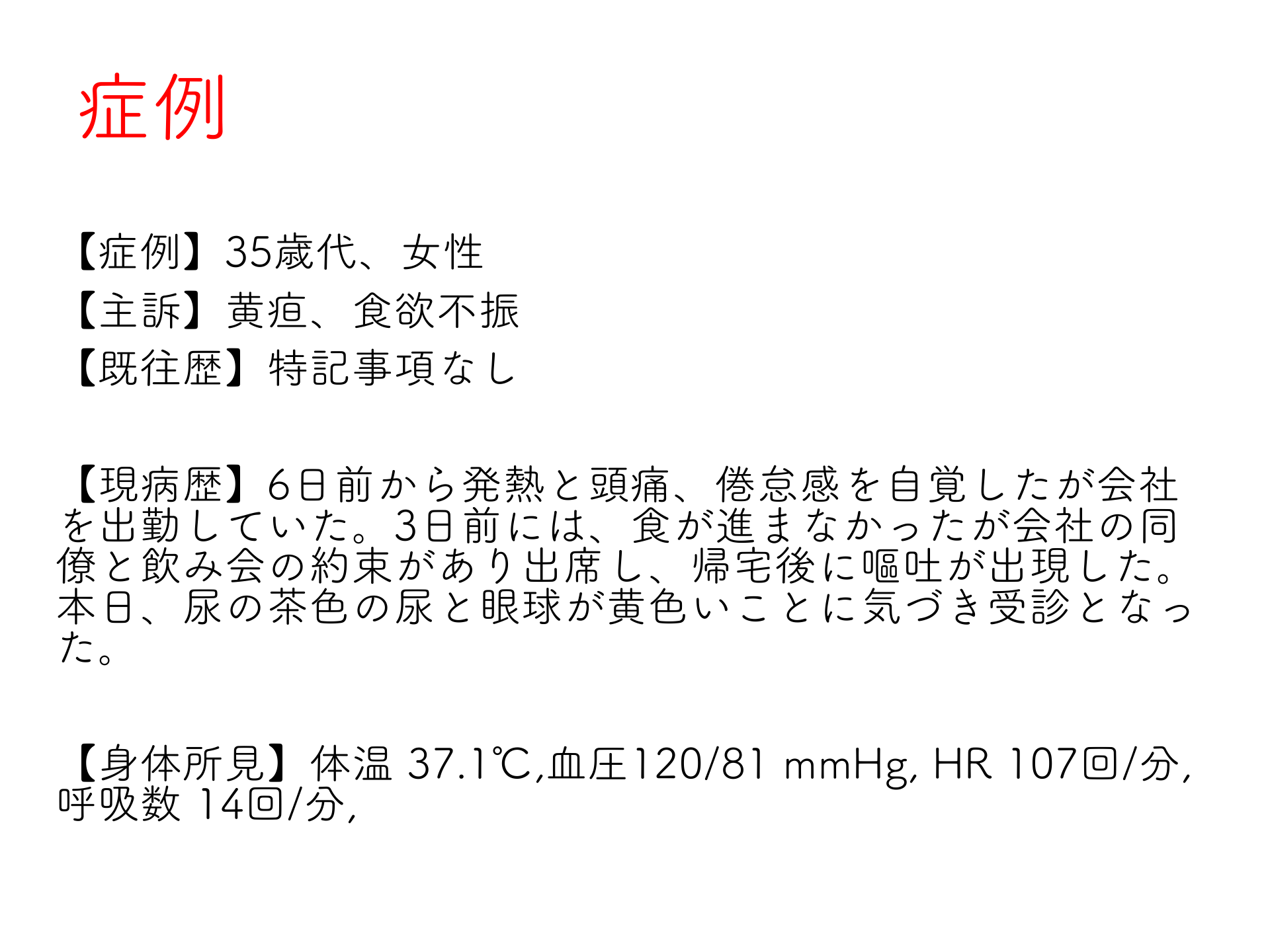 #2. 症例 【症例】35歳代、女性 【主訴】黄疸、食欲不振 【既往歴】特記事項なし 【現病歴】6日前から発熱と頭痛、倦怠感を自覚したが会社 を出勤していた。3日前には、食が進まなかったが会社の同 僚と飲み会の約束があり出席し、帰宅後に嘔吐が出現した。 本日、尿の茶色の尿と眼球が黄色いことに気づき受診となっ た。 【身体所見】体温 37.1℃,血圧120/81 mmHg, HR 107回/分, 呼吸数 14回/分,
