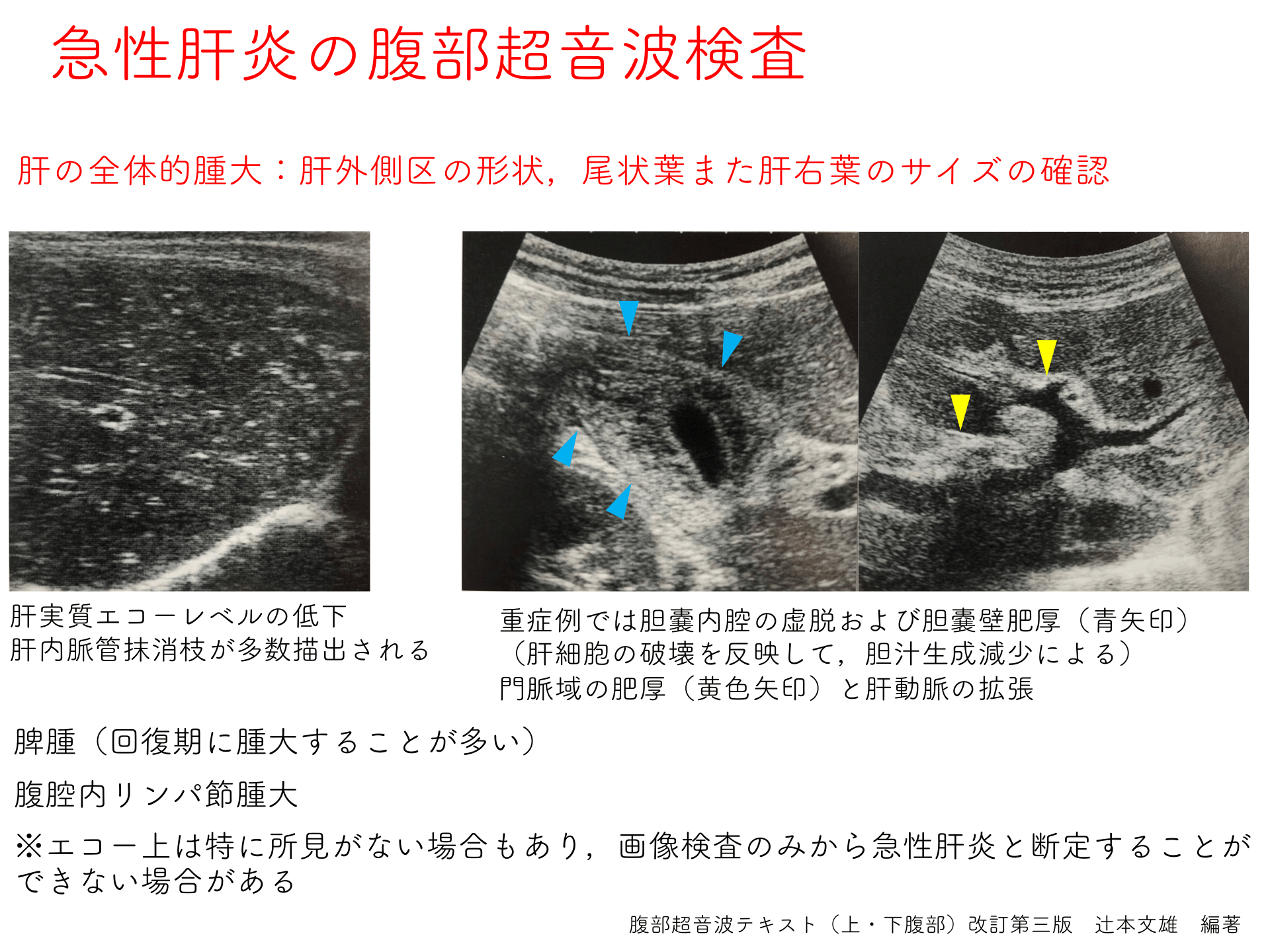#20. 急性肝炎の腹部超音波検査 肝の全体的腫大:肝外側区の形状,尾状葉また肝右葉のサイズの確認 肝実質エコーレベルの低下 肝内脈管抹消枝が多数描出される 重症例では胆嚢内腔の虚脱および胆嚢壁肥厚(青矢印) (肝細胞の破壊を反映して,胆汁生成減少による) 門脈域の肥厚(黄色矢印)と肝動脈の拡張 脾腫(回復期に腫大することが多い) 腹腔内リンパ節腫大 ※エコー上は特に所見がない場合もあり,画像検査のみから急性肝炎と断定することが できない場合がある 腹部超音波テキスト(上・下腹部)改訂第三版 辻本文雄 編著