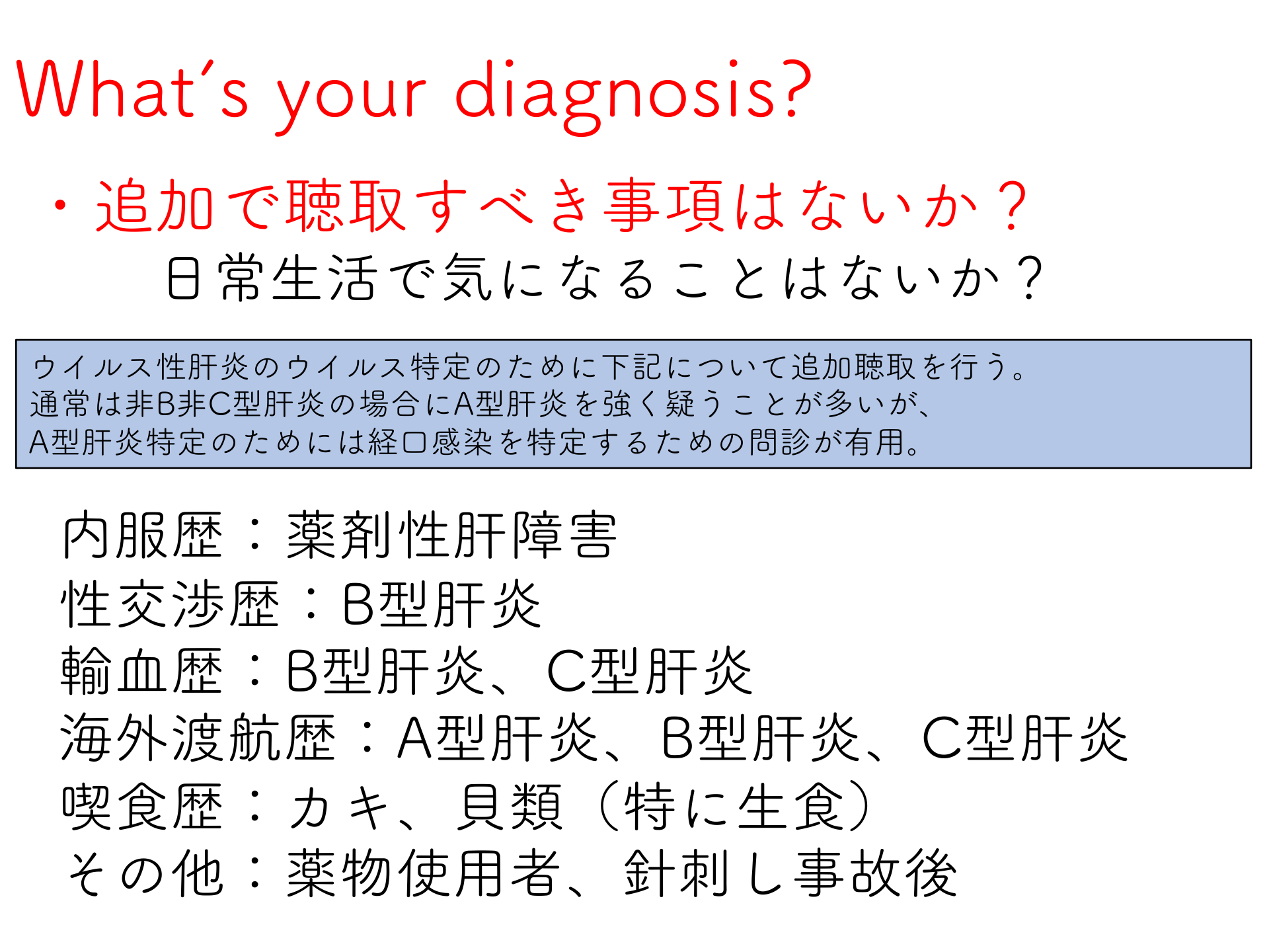 #21. What s your diagnosis? ・追加で聴取すべき事項はないか? 日常生活で気になることはないか? ウイルス性肝炎のウイルス特定のために下記について追加聴取を行う。 通常は非B非C型肝炎の場合にA型肝炎を強く疑うことが多いが、 A型肝炎特定のためには経口感染を特定するための問診が有用。 内服歴:薬剤性肝障害 性交渉歴:B型肝炎 輸血歴:B型肝炎、C型肝炎 海外渡航歴:A型肝炎、B型肝炎、C型肝炎 喫食歴:カキ、貝類(特に生食) その他:薬物使用者、針刺し事故後