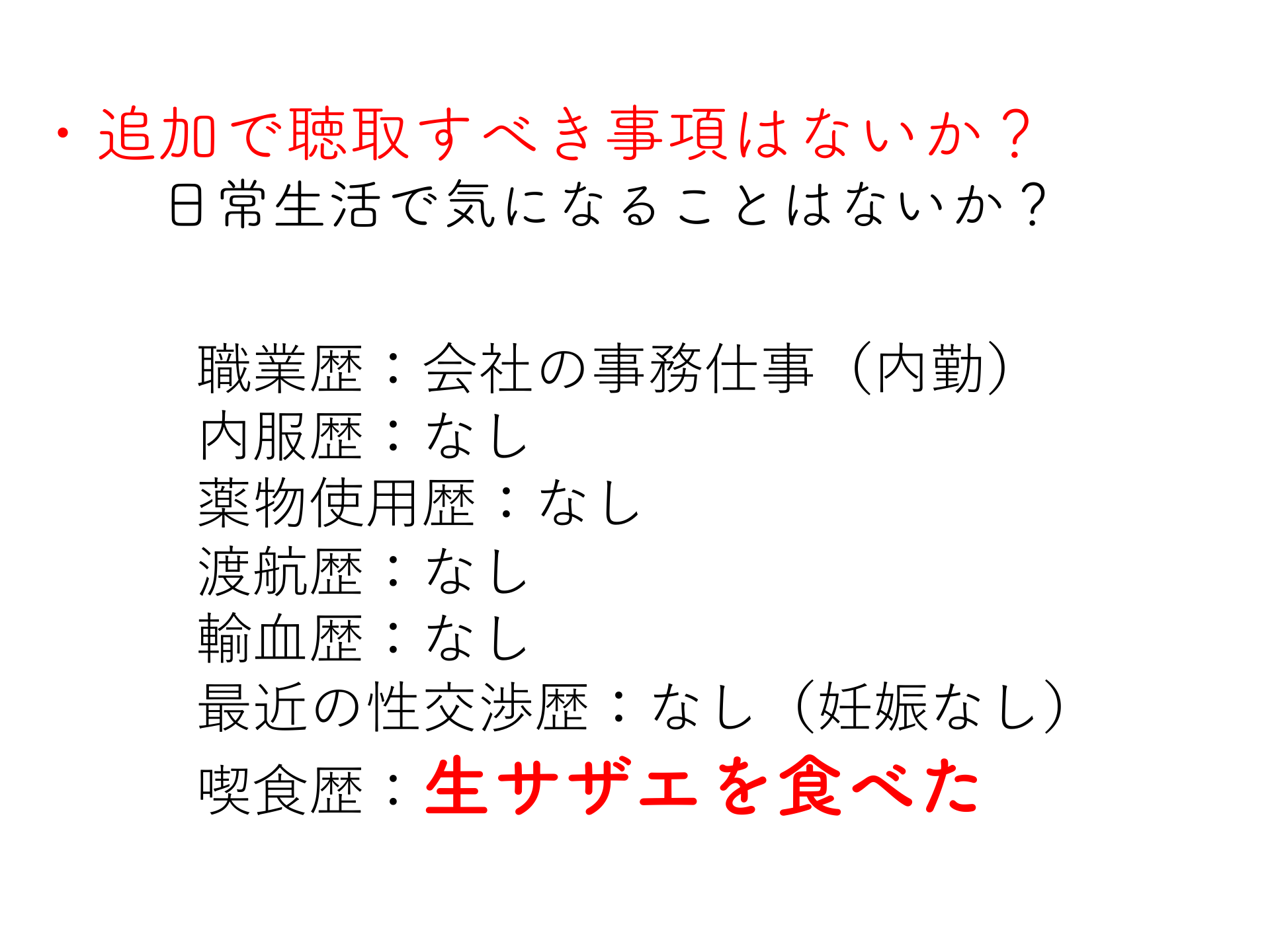#22. ・追加で聴取すべき事項はないか? 日常生活で気になることはないか? 職業歴:会社の事務仕事(内勤) 内服歴:なし 薬物使⽤歴:なし 渡航歴:なし 輸⾎歴:なし 最近の性交渉歴:なし(妊娠なし) 喫⾷歴:生サザエを食べた
