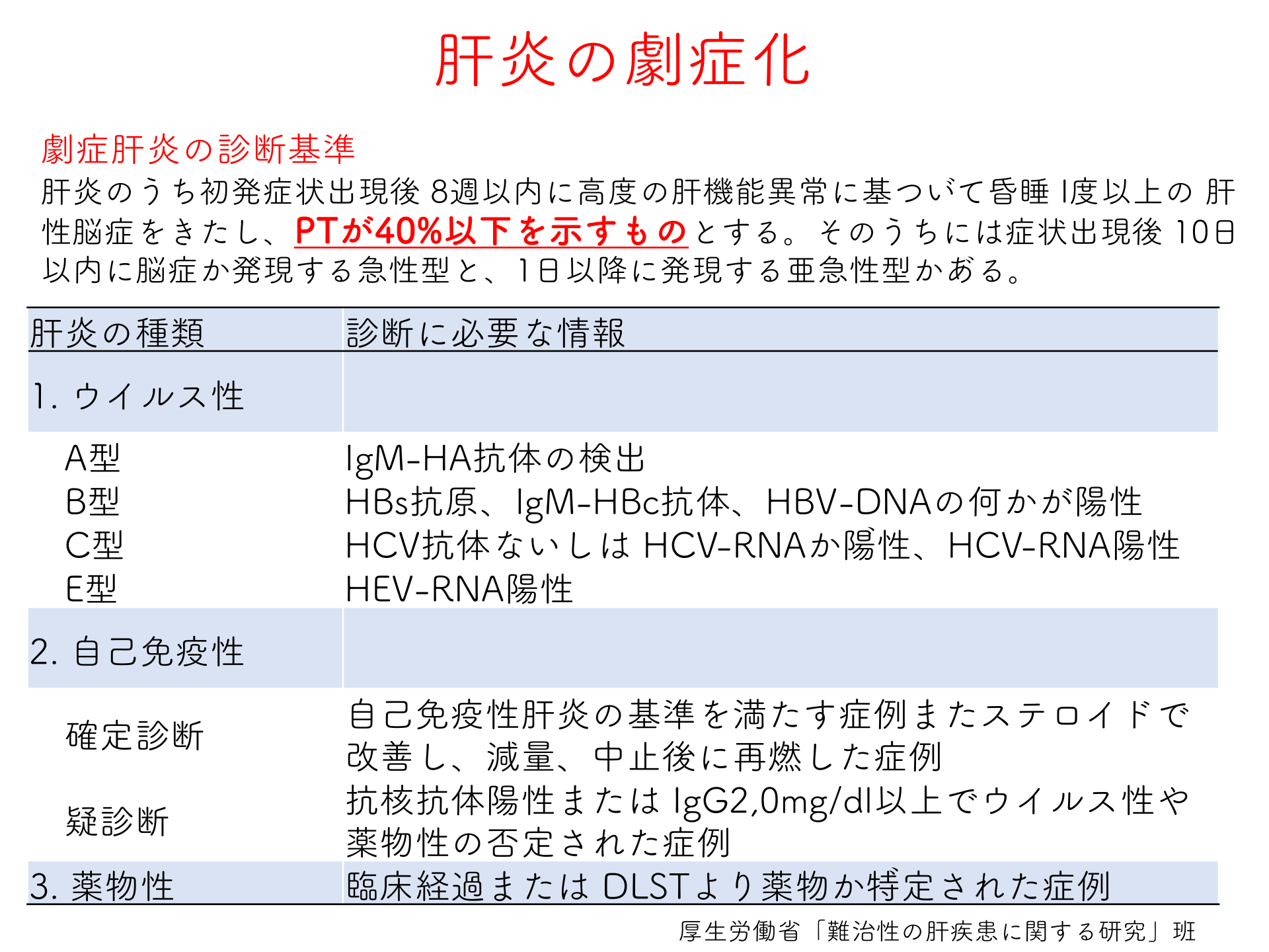 #23. 肝炎の劇症化 劇症肝炎の診断基準 肝炎のうち初発症状出現後 8週以内に高度の肝機能異常に基づ いて昏睡 I度以上の 肝 性脳症をきたし、PTが40%以下を示すものとする。そのうちには症状出現後 10日 以内に脳症が 発現する急性型と、1日以降に発現する亜急性型が ある。 肝炎の種類 診断に必要な情報 1. ウイルス性 A型 B型 C型 E型 IgM-HA抗体の検出 HBs抗原、IgM-HBc抗体、HBV-DNAの何かが陽性 HCV抗体ないしは HCV-RNAが 陽性、HCV-RNA陽性 HEV-RNA陽性 2. 自己免疫性 確定診断 疑診断 3. 薬物性 自己免疫性肝炎の基準を満たす症例またステロイドで 改善し、減量、中止後に再燃した症例 抗核抗体陽性または IgG2,0mg/dl以上でウイルス性や 薬物性の否定された症例 臨床経過または DLSTより薬物が 特定された症例 厚生労働省「難治性の肝疾患に関する研究」班