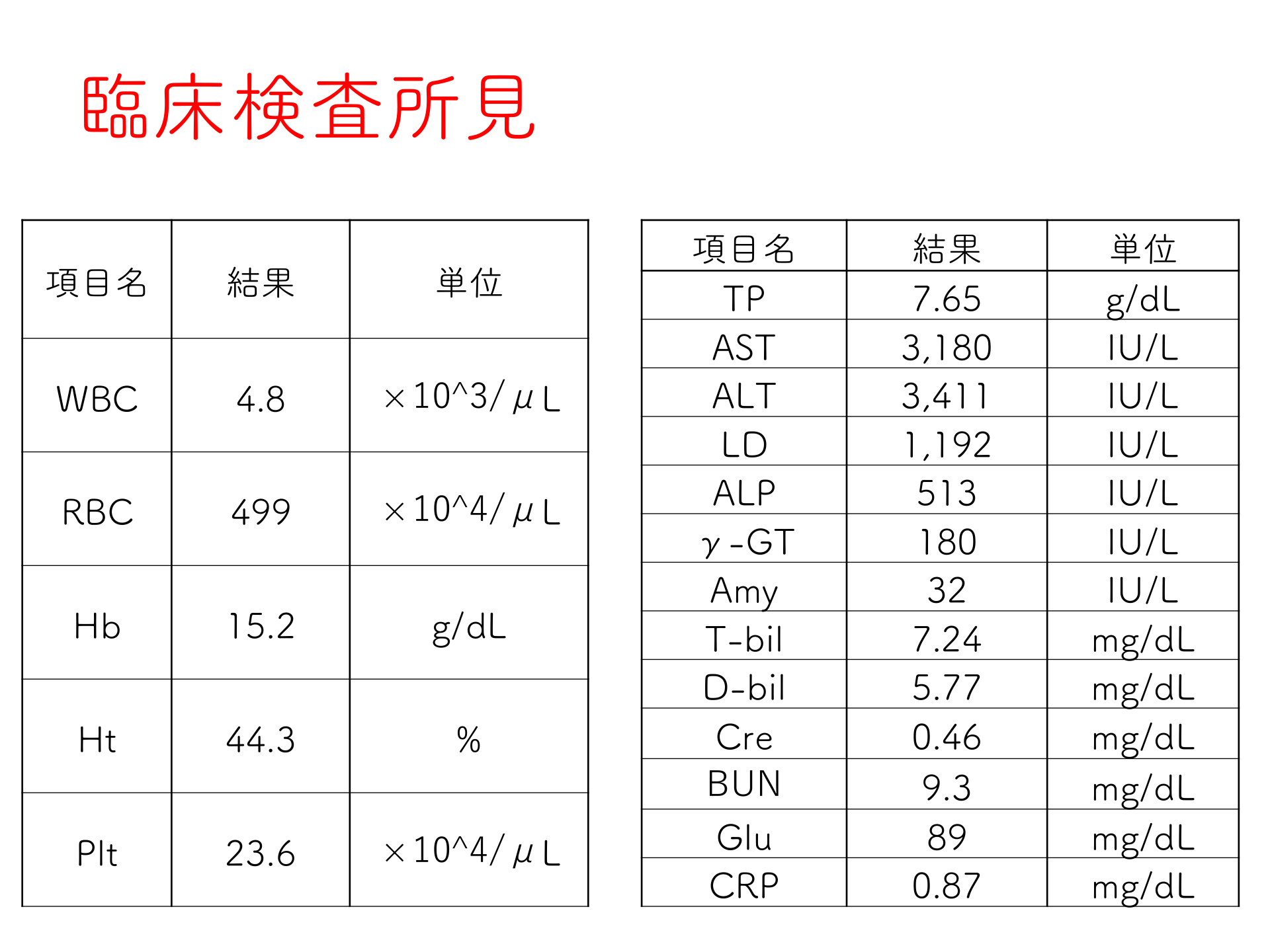 #3. 臨床検査所見 項目名 結果 単位 WBC 4.8 ×10^3/μL RBC 499 ×10^4/μL Hb 15.2 g/dL Ht 44.3 % Plt 23.6 ×10^4/μL 項目名 TP AST ALT LD ALP γ-GT Amy T-bil D-bil Cre BUN Glu CRP 結果 7.65 3,180 3,411 1,192 513 180 32 7.24 5.77 0.46 9.3 89 0.87 単位 g/dL IU/L IU/L IU/L IU/L IU/L IU/L mg/dL mg/dL mg/dL mg/dL mg/dL mg/dL