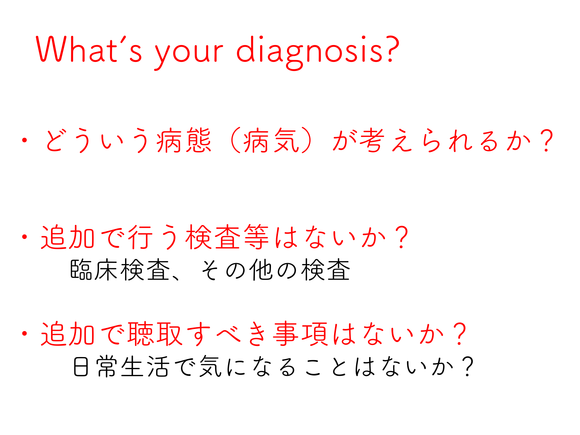 #4. What s your diagnosis? ・どういう病態(病気)が考えられるか? ・追加で行う検査等はないか? 臨床検査、その他の検査 ・追加で聴取すべき事項はないか? 日常生活で気になることはないか?