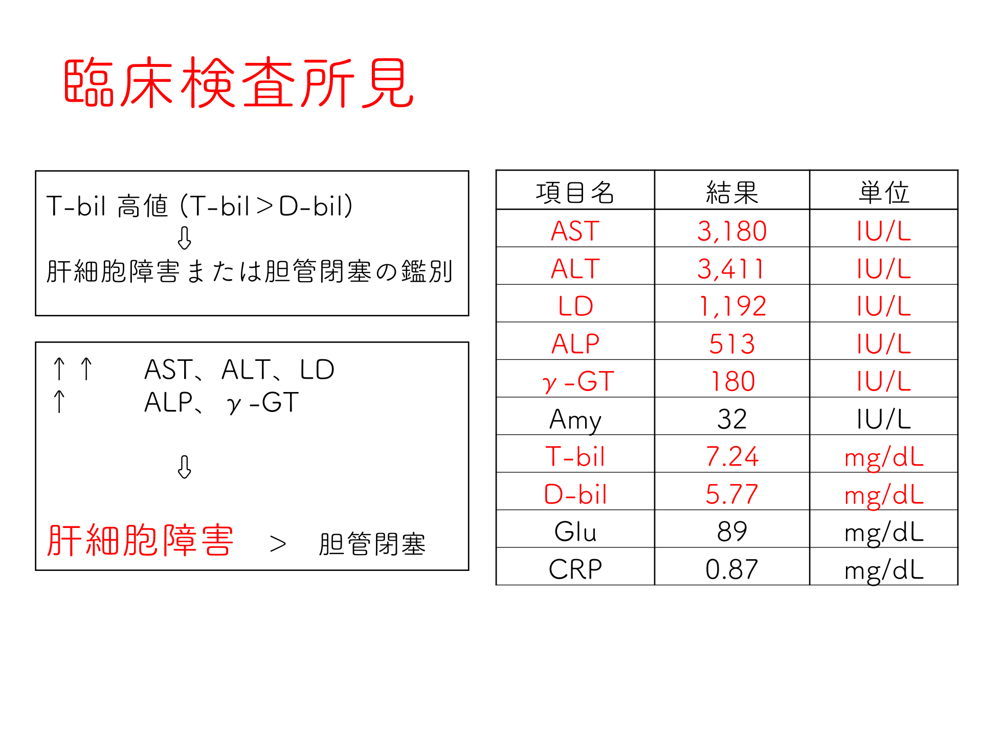 #7. 臨床検査所見 T-bil 高値 (T-bil>D-bil) ⇩ 肝細胞障害または胆管閉塞の鑑別 ↑↑ ↑ AST、ALT、LD ALP、γ-GT ⇩ 肝細胞障害 > 胆管閉塞 項目名 AST ALT LD ALP γ-GT Amy T-bil D-bil Glu CRP 結果 3,180 3,411 1,192 513 180 32 7.24 5.77 89 0.87 単位 IU/L IU/L IU/L IU/L IU/L IU/L mg/dL mg/dL mg/dL mg/dL