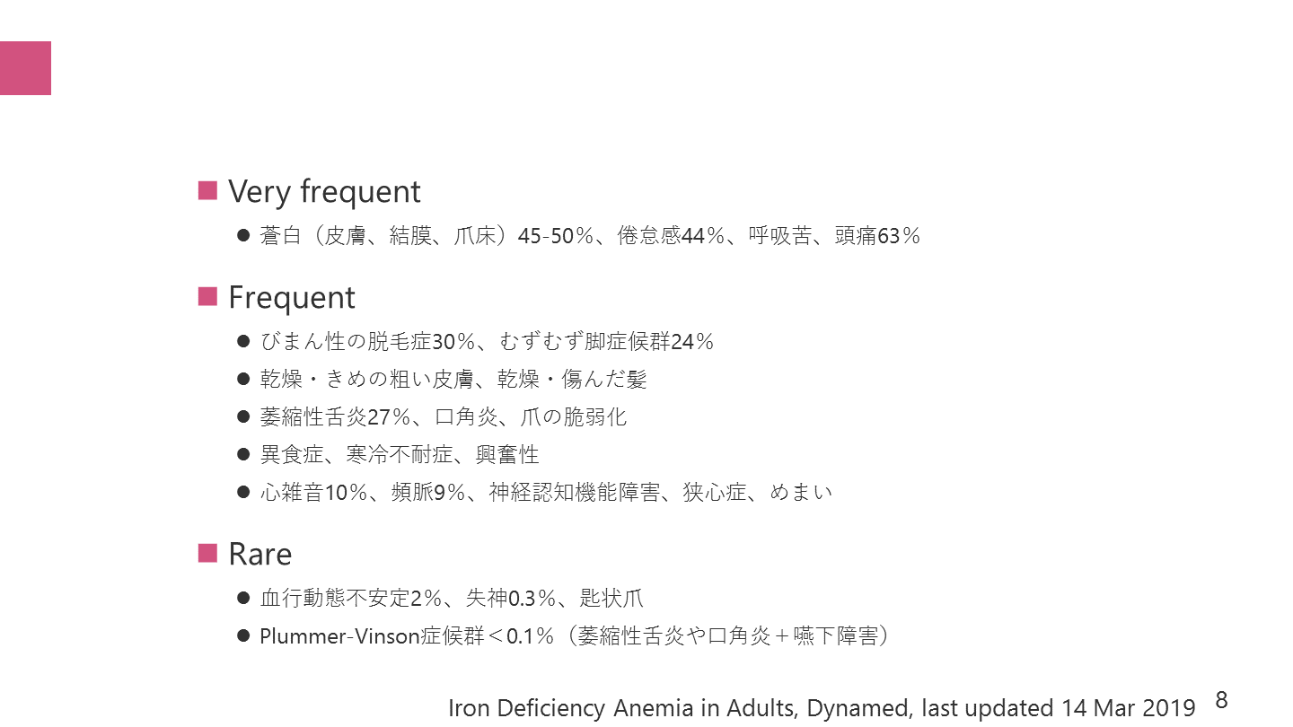 Plummer-Vinson症候群<0.1%(萎縮性舌炎や口角炎+嚥下障害) Iron Deficiency Anemia in Adults, Dynamed, last updated 14 Mar 2019