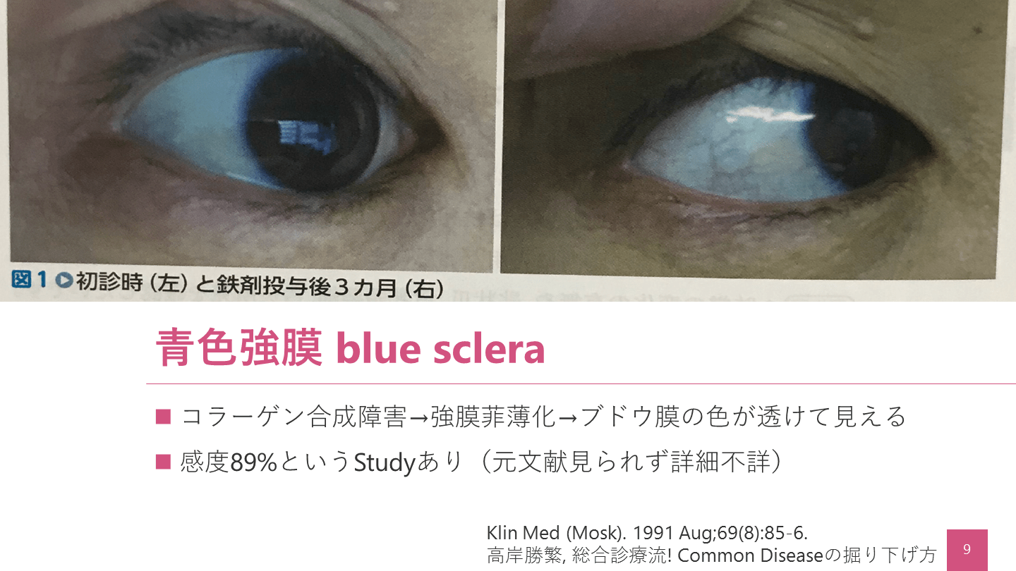 #9. 9 青色強膜 blue sclera コラーゲン合成障害→強膜菲薄化→ブドウ膜の色が透けて見える