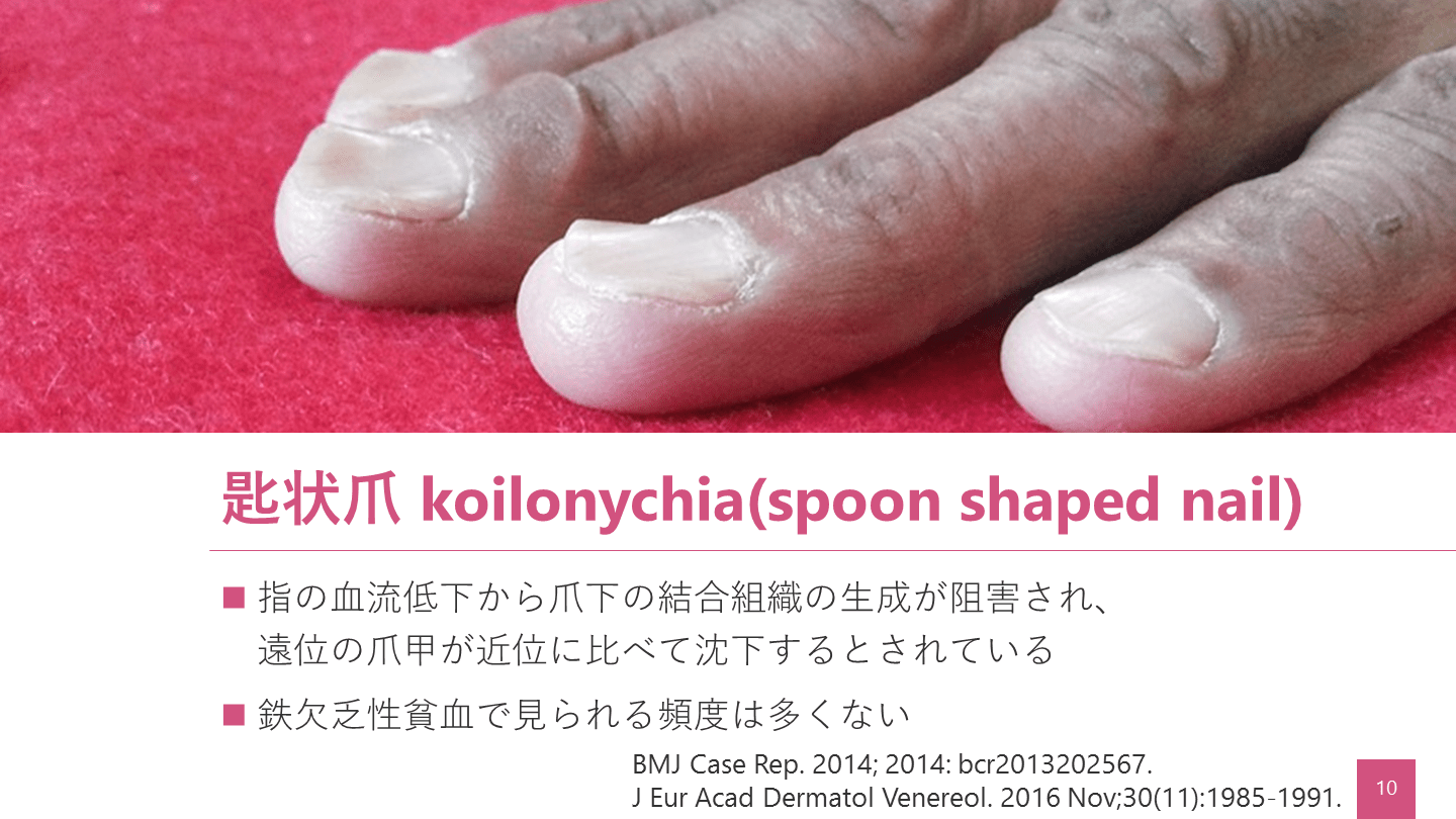 #10. 10 匙状爪 koilonychia(spoon shaped nail) 指の血流低下から爪下の結合組織の生成が阻害され、遠位の爪甲が近位に比べて沈下するとされている