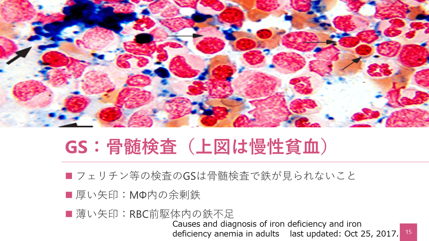 #15. 15 GS:骨髄検査(上図は慢性貧血) フェリチン等の検査のGSは骨髄検査で鉄が見られないこと