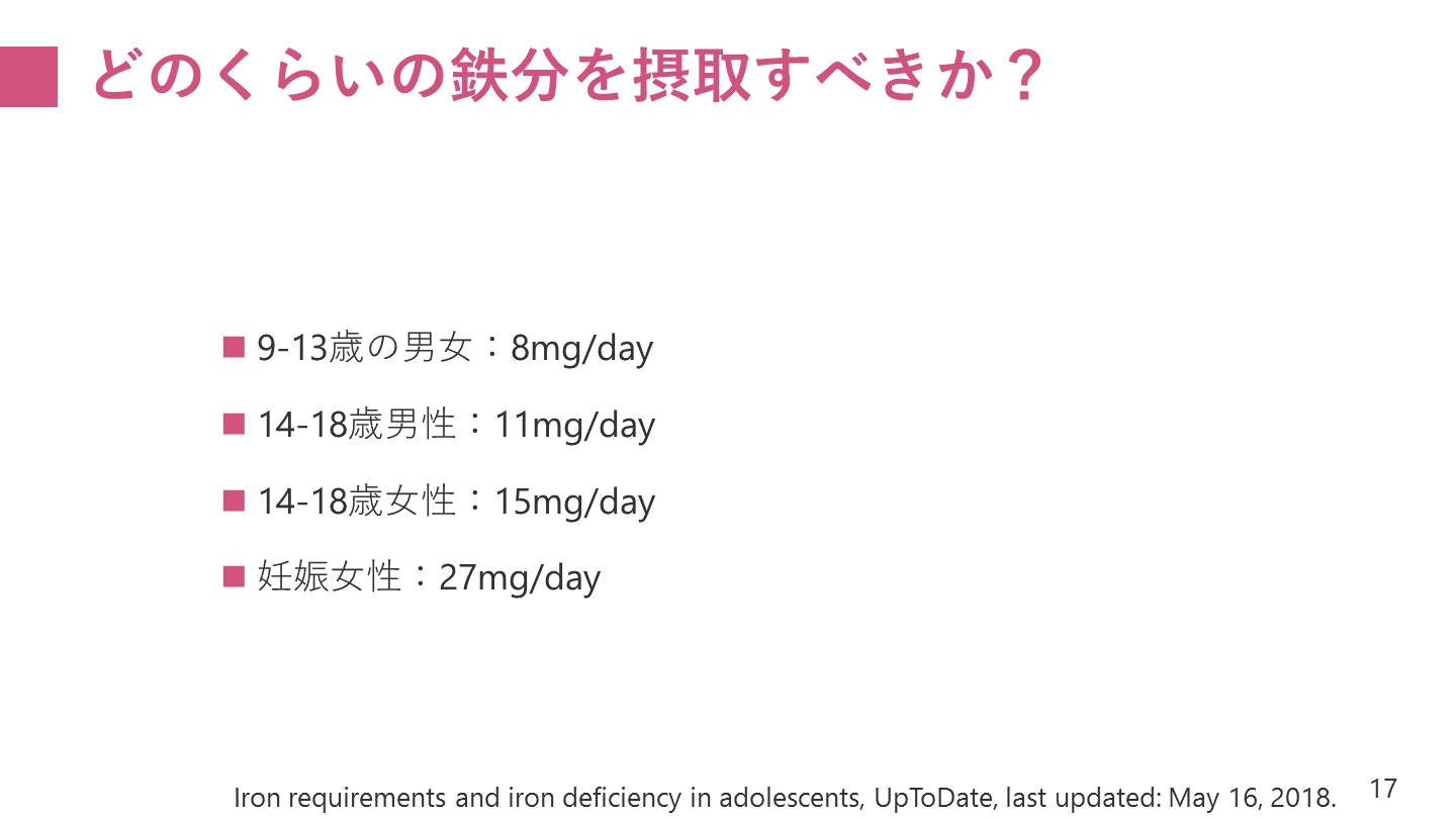 #17. どのくらいの鉄分を摂取すべきか? 17 9-13歳の男女:8mg/day