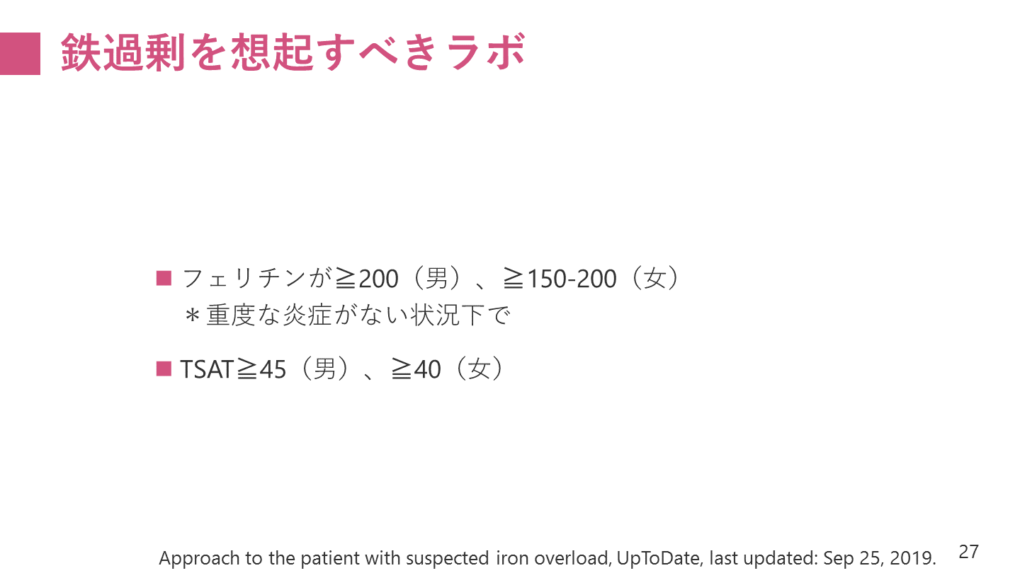 #27. 鉄過剰を想起すべきラボ 27 フェリチンが≧200(男)、≧150-200(女)*重度な炎症がない状況下で