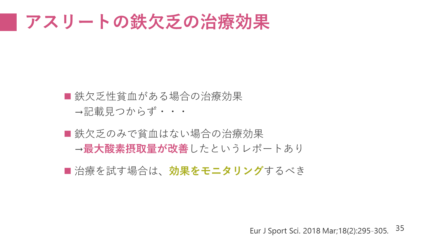 #35. アスリートの鉄欠乏の治療効果 35 鉄欠乏性貧血がある場合の治療効果→記載見つからず・・・