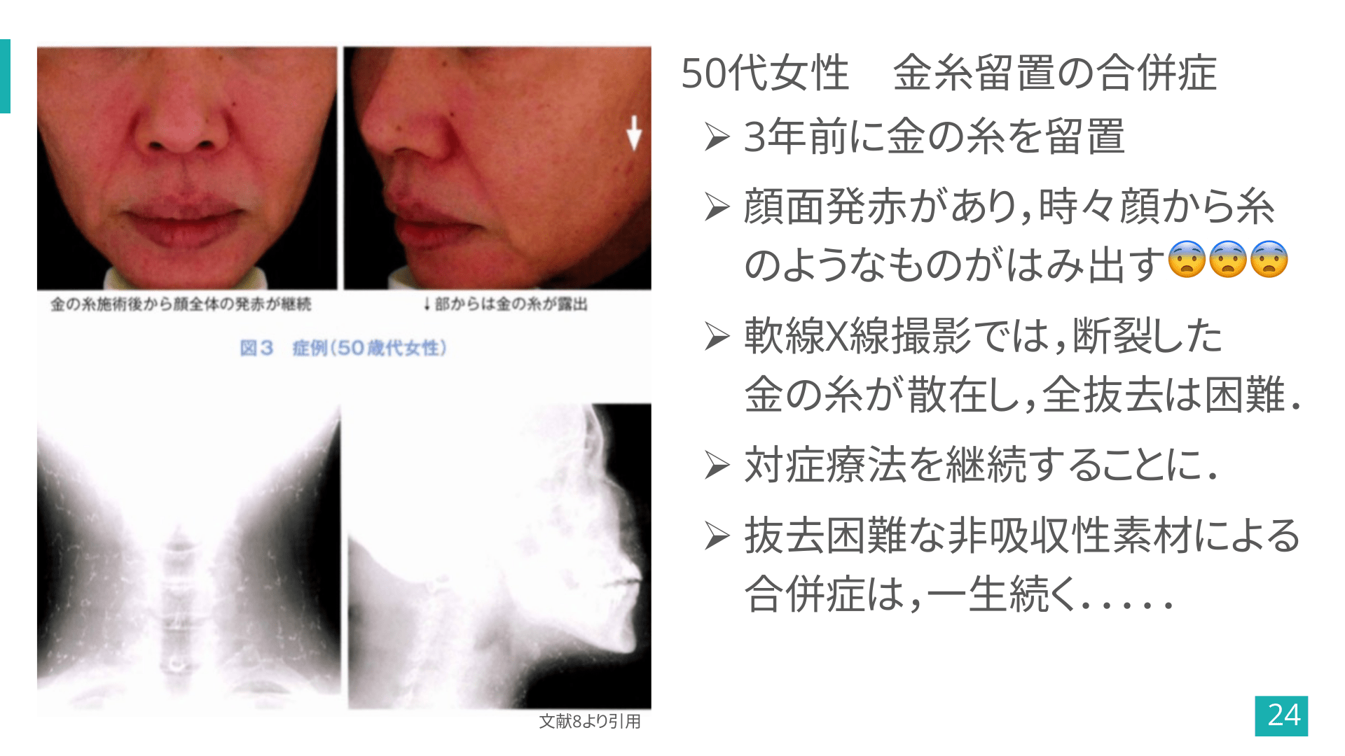 #24. 50代女性 金糸留置の合併症 Ø 3年前に金の糸を留置 Ø 顔面発赤があり,時々顔から糸 のようなものがはみ出す😨😨😨 Ø 軟線X線撮影では,断裂した 金の糸が散在し,全抜去は困難. Ø 対症療法を継続することに. Ø 抜去困難な非吸収性素材による 合併症は,一生続く..... 文献8より引用 24