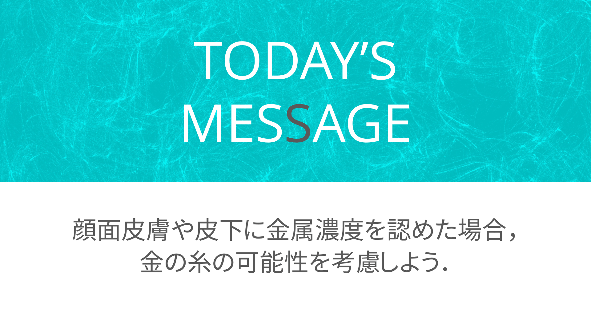 #14. TODAY’S MESSAGE 顔面皮膚や皮下に金属濃度を認めた場合, 金の糸の可能性も考慮しよう.