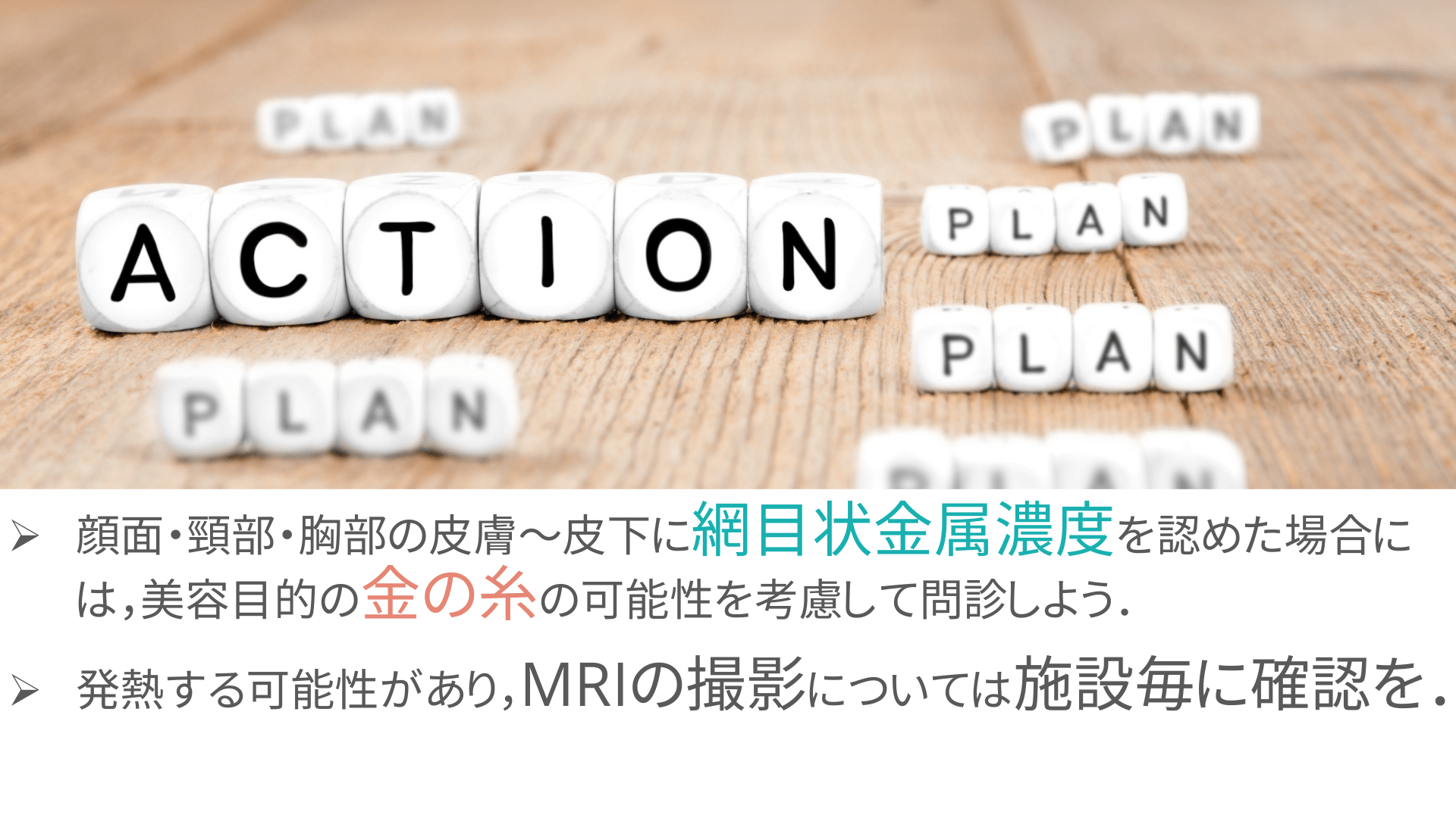 #26. Ø 顔面・頸部・胸部の皮膚〜皮下に網目状金属濃度を認めた場合に は,美容目的の金の糸の可能性を考慮して問診しよう. Ø 発熱する可能性があり,MRIの撮影については施設毎に確認を.