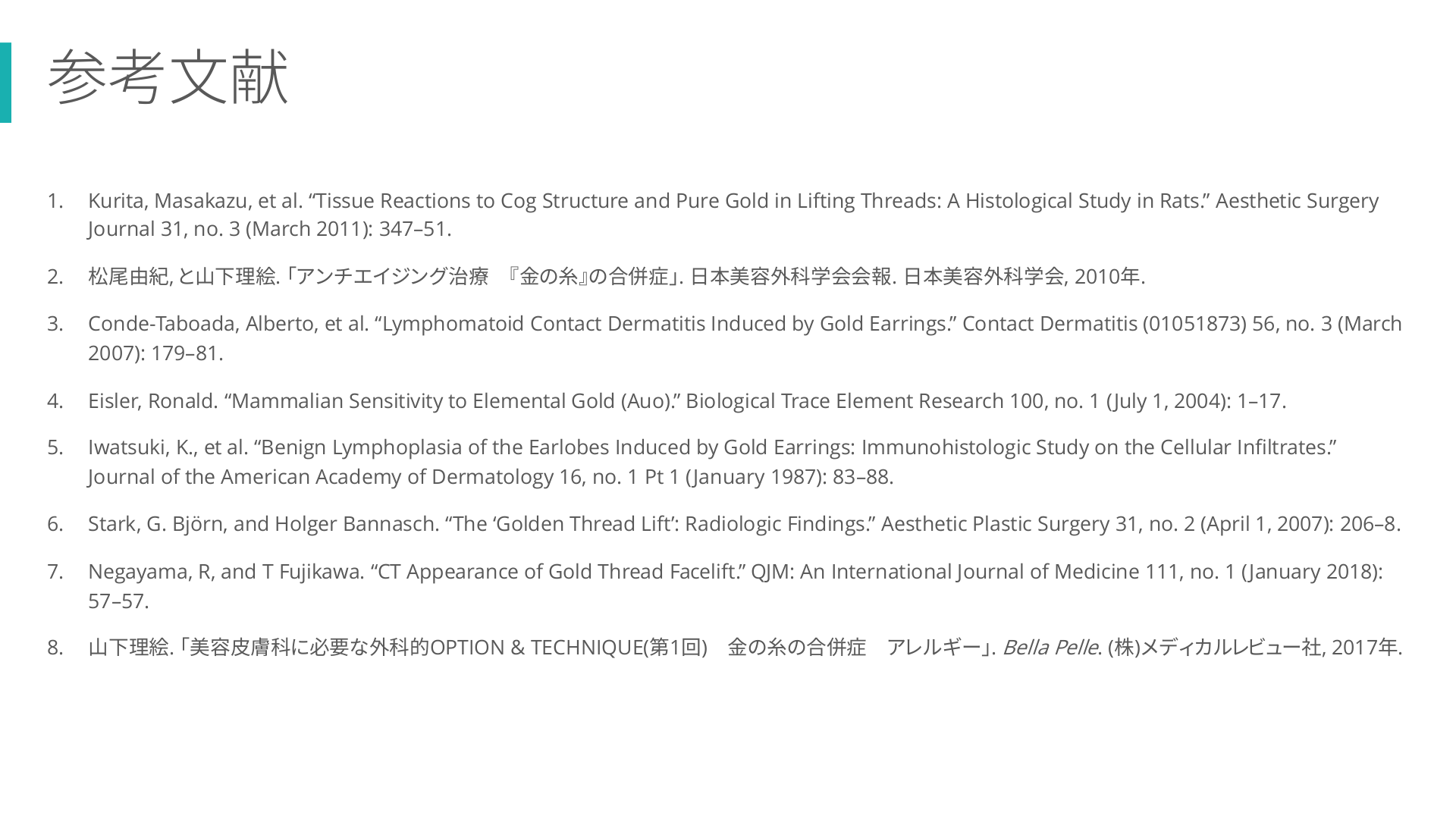 #27. 参考文献 1. Kurita, Masakazu, et al. “Tissue Reactions to Cog Structure and Pure Gold in Lifting Threads: A Histological Study in Rats.” Aesthetic Surgery Journal 31, no. 3 (March 2011): 347–51. 2. 松尾由紀, と山下理絵. 「アンチエイジング治療 3. Conde-Taboada, Alberto, et al. “Lymphomatoid Contact Dermatitis Induced by Gold Earrings.” Contact Dermatitis (01051873) 56, no. 3 (March 2007): 179–81. 4. Eisler, Ronald. “Mammalian Sensitivity to Elemental Gold (Auo).” Biological Trace Element Research 100, no. 1 (July 1, 2004): 1–17. 5. Iwatsuki, K., et al. “Benign Lymphoplasia of the Earlobes Induced by Gold Earrings: Immunohistologic Study on the Cellular Infiltrates.” Journal of the American Academy of Dermatology 16, no. 1 Pt 1 (January 1987): 83–88. 6. Stark, G. Björn, and Holger Bannasch. “The ‘Golden Thread Lift’: Radiologic Findings.” Aesthetic Plastic Surgery 31, no. 2 (April 1, 2007): 206–8. 7. Negayama, R, and T Fujikawa. “CT Appearance of Gold Thread Facelift.” QJM: An International Journa