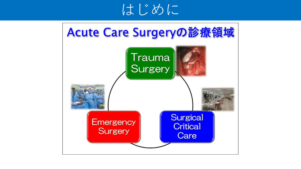 アメリカではTrauma surgery、日本では救急外科と呼ばれてきた分野が、急性腹症や外科的集中治療を含めながら発展したものです。