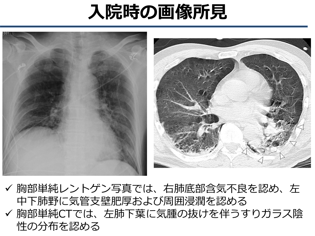 #10. 入院時の画像所見 胸部単純レントゲン写真では、右肺底部含気不良を認め、左 中下肺野に気管支壁肥厚および周囲浸潤を認める 胸部単純CTでは、左肺下葉に気腫の抜けを伴うすりガラス陰 性の分布を認める