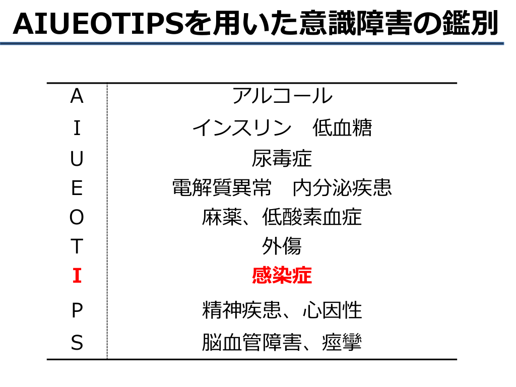 #11. AIUEOTIPSを用いた意識障害の鑑別 A I アルコール インスリン 低血糖 U E O T I 尿毒症 電解質異常 内分泌疾患 麻薬、低酸素血症 外傷 感染症 P 精神疾患、心因性 S 脳血管障害、痙攣