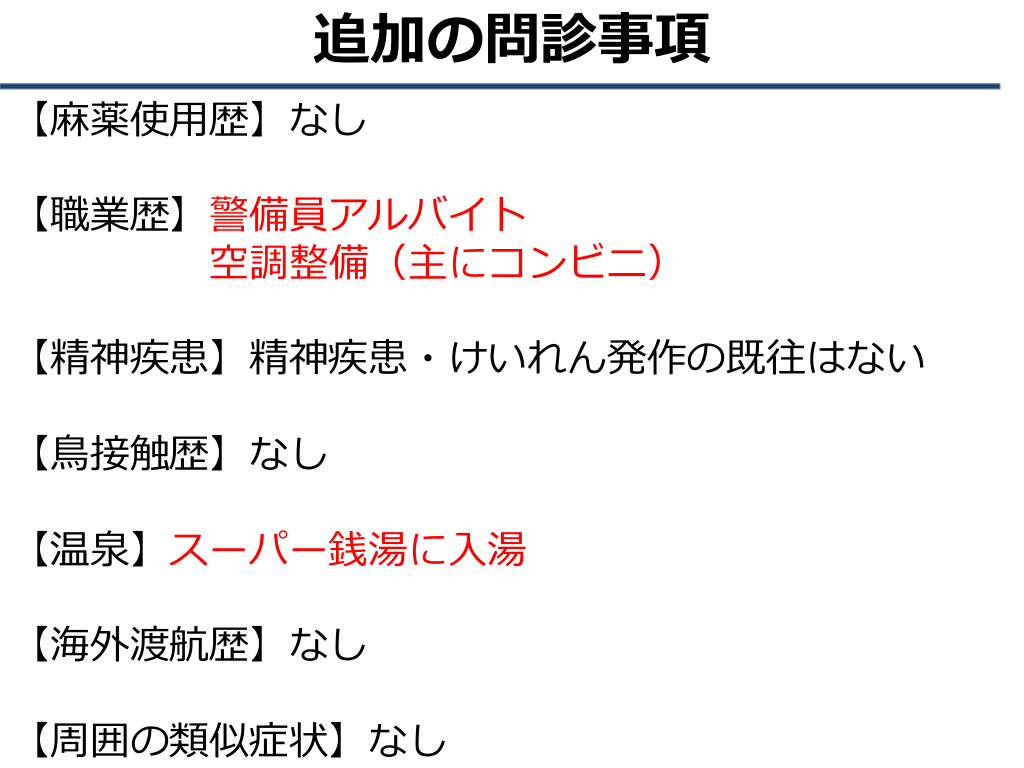 #12. 追加の問診事項 【麻薬使用歴】なし 【職業歴】警備員アルバイト 空調整備(主にコンビニ) 【精神疾患】精神疾患・けいれん発作の既往はない 【鳥接触歴】なし 【温泉】スーパー銭湯に入湯 【海外渡航歴】なし 【周囲の類似症状】なし