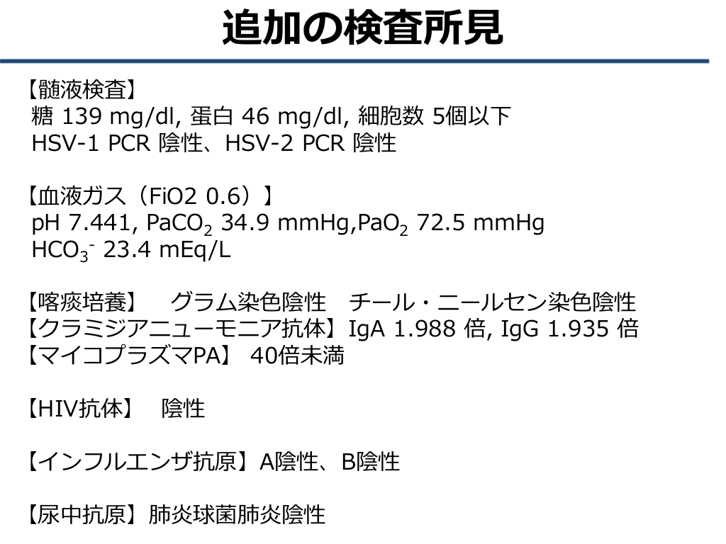 #13. 追加の検査所見 【髄液検査】 糖 139 mg/dl, 蛋白 46 mg/dl, 細胞数 5個以下 HSV-1 PCR 陰性、HSV-2 PCR 陰性 【血液ガス(FiO2 0.6)】 pH 7.441, PaCO2 34.9 mmHg,PaO2 72.5 mmHg HCO3- 23.4 mEq/L 【喀痰培養】 グラム染色陰性 チール・ニールセン染色陰性 【クラミジアニューモニア抗体】IgA 1.988 倍, IgG 1.935 倍 【マイコプラズマPA】 40倍未満 【HIV抗体】 陰性 【インフルエンザ抗原】A陰性、B陰性 【尿中抗原】肺炎球菌肺炎陰性