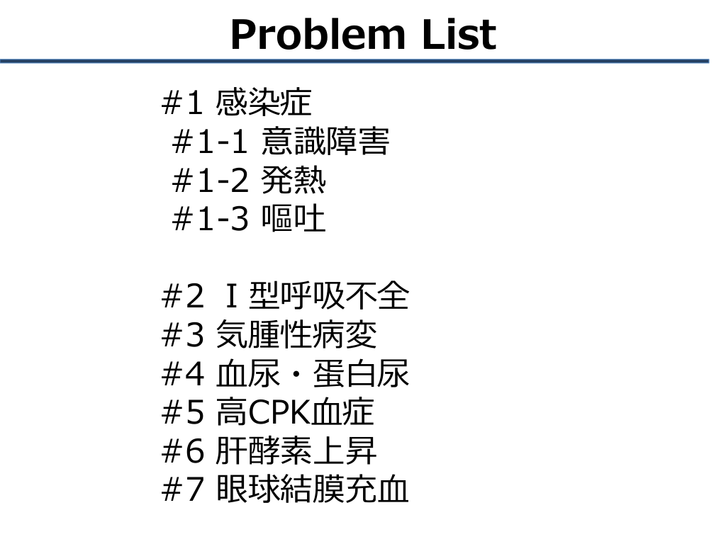 #14. Problem List #1 感染症 #1-1 意識障害 #1-2 発熱 #1-3 嘔吐 #2 #3 #4 #5 #6 #7 Ⅰ型呼吸不全 気腫性病変 血尿・蛋白尿 高CPK血症 肝酵素上昇 眼球結膜充血
