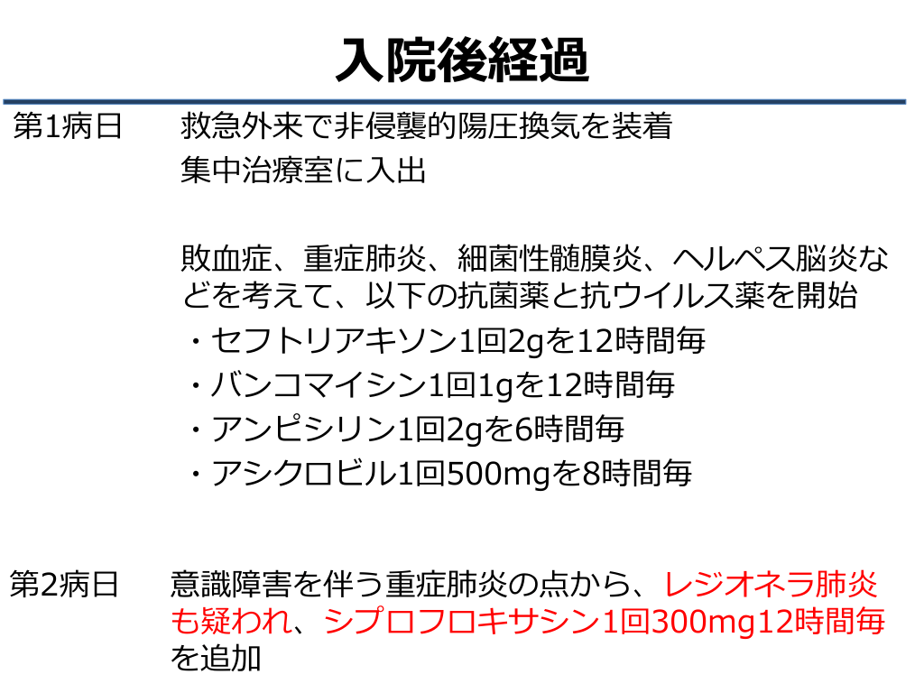 #15. 入院後経過 第1病日 救急外来で非侵襲的陽圧換気を装着 集中治療室に入出 敗血症、重症肺炎、細菌性髄膜炎、ヘルペス脳炎な どを考えて、以下の抗菌薬と抗ウイルス薬を開始 ・セフトリアキソン1回2gを12時間毎 ・バンコマイシン1回1gを12時間毎 ・アンピシリン1回2gを6時間毎 ・アシクロビル1回500mgを8時間毎 第2病日 意識障害を伴う重症肺炎の点から、レジオネラ肺炎 も疑われ、シプロフロキサシン1回300mg12時間毎 を追加