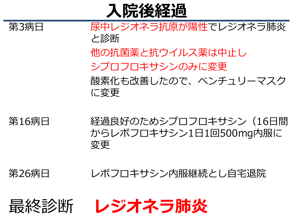 #16. 入院後経過 第3病日 尿中レジオネラ抗原が陽性でレジオネラ肺炎 と診断 他の抗菌薬と抗ウイルス薬は中止し シプロフロキサシンのみに変更 酸素化も改善したので、ベンチュリーマスク に変更 第16病日 経過良好のためシプロフロキサシン(16日間 からレボフロキサシン1日1回500mg内服に 変更 第26病日 レボフロキサシン内服継続とし自宅退院 最終診断 レジオネラ肺炎