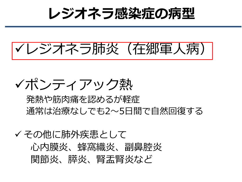 #17. レジオネラ感染症の病型 レジオネラ肺炎(在郷軍人病) ポンティアック熱 発熱や筋肉痛を認めるが軽症 通常は治療なしでも2~5日間で自然回復する その他に肺外疾患として 心内膜炎、蜂窩織炎、副鼻腔炎 関節炎、膵炎、腎盂腎炎など