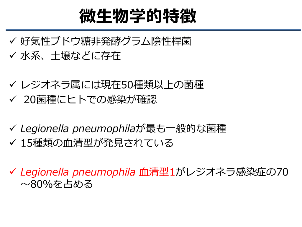 #18. 微生物学的特徴 好気性ブドウ糖非発酵グラム陰性桿菌 水系、土壌などに存在 レジオネラ属には現在50種類以上の菌種 20菌種にヒトでの感染が確認 Legionella pneumophilaが最も一般的な菌種 15種類の血清型が発見されている Legionella pneumophila 血清型1がレジオネラ感染症の70 ~80%を占める