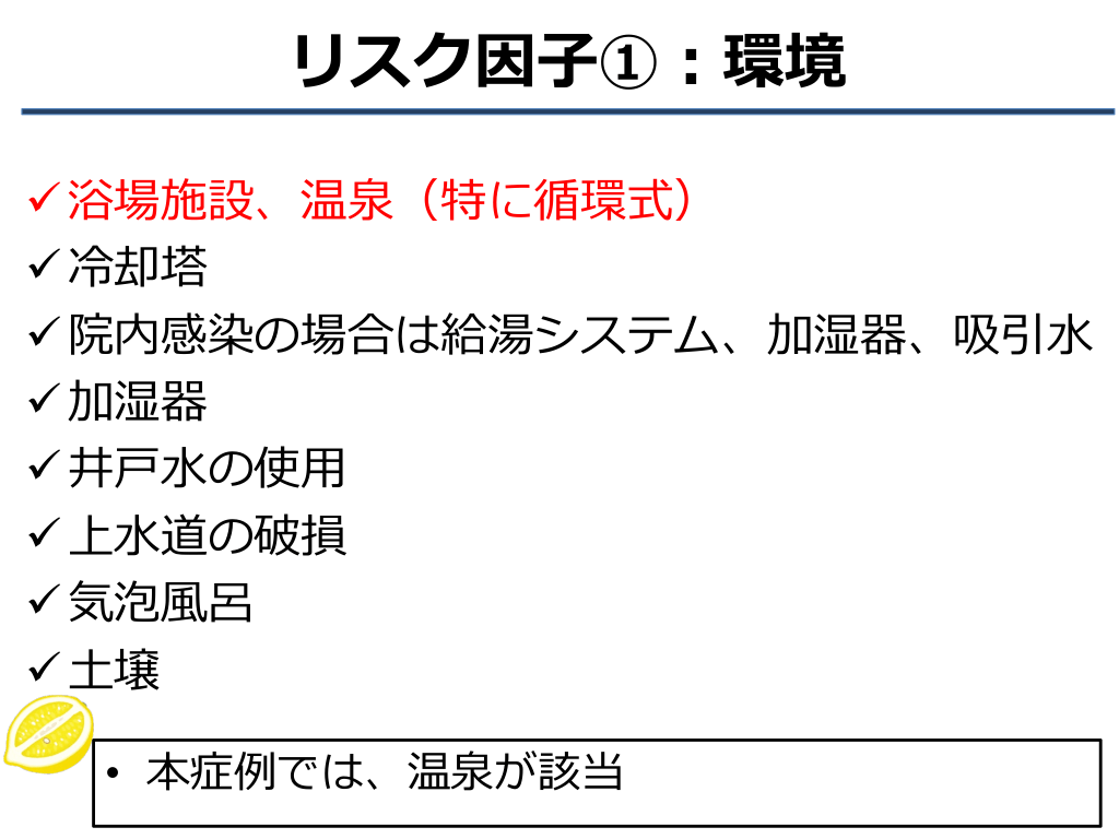 #19. リスク因子①:環境 浴場施設、温泉(特に循環式) 冷却塔 院内感染の場合は給湯システム、加湿器、吸引水 加湿器 井戸水の使用 上水道の破損 気泡風呂 土壌 • 本症例では、温泉が該当