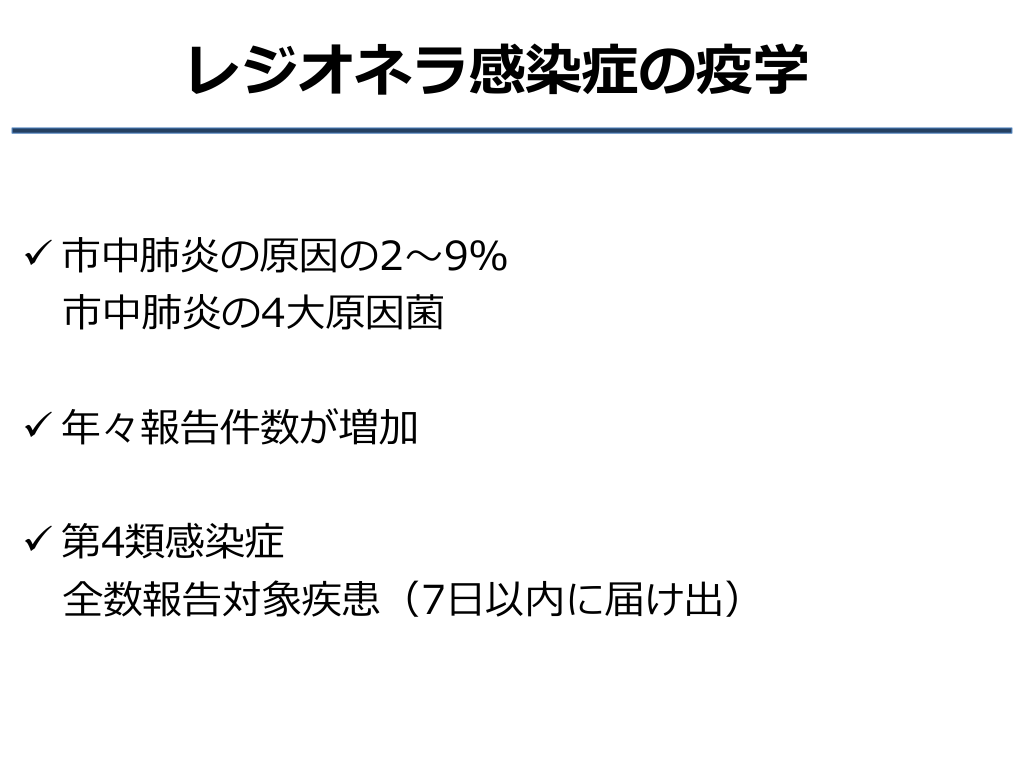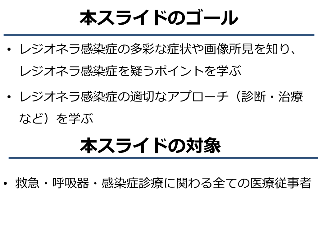 #2. 本スライドのゴール • レジオネラ感染症の多彩な症状や画像所見を知り、 レジオネラ感染症を疑うポイントを学ぶ • レジオネラ感染症の適切なアプローチ(診断・治療 など)を学ぶ 本スライドの対象 • 救急・呼吸器・感染症診療に関わる全ての医療従事者
