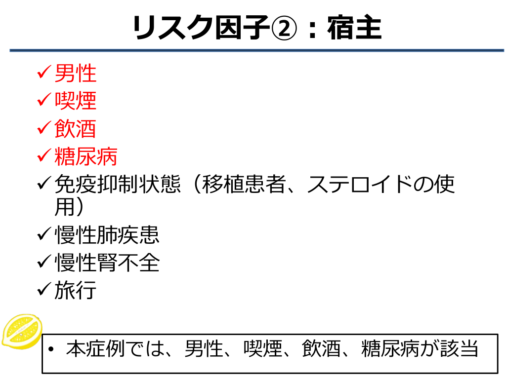#20. リスク因子②:宿主 男性 喫煙 飲酒 糖尿病 免疫抑制状態(移植患者、ステロイドの使 用) 慢性肺疾患 慢性腎不全 旅行 • 本症例では、男性、喫煙、飲酒、糖尿病が該当