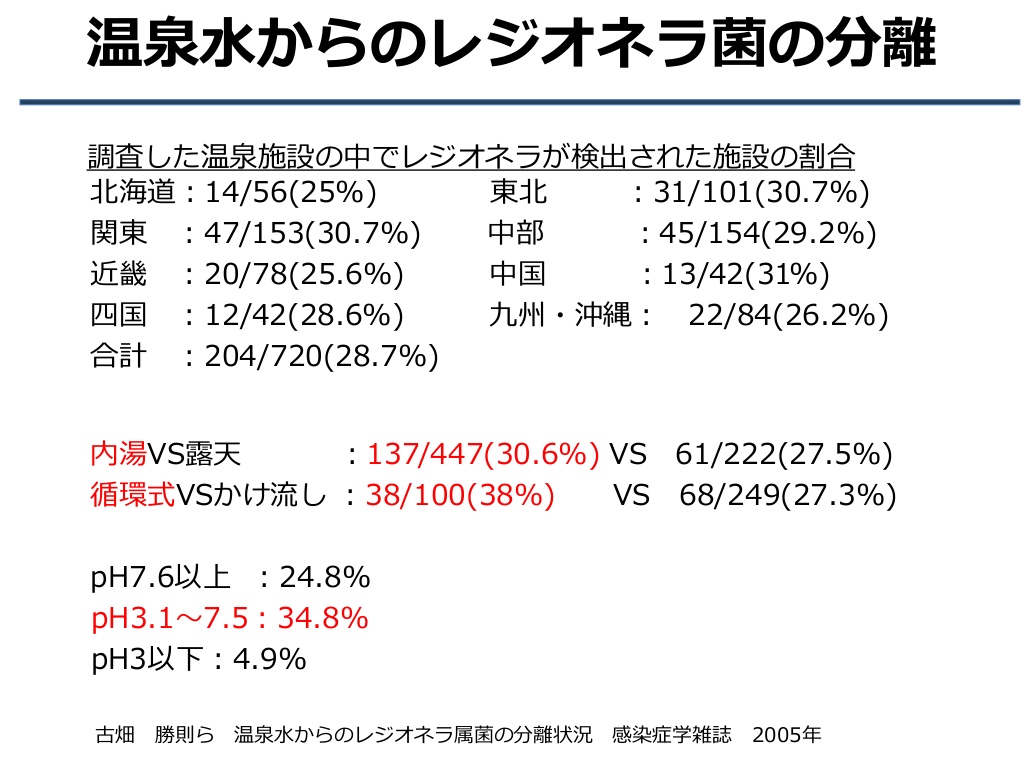 #21. 温泉水からのレジオネラ菌の分離 調査した温泉施設の中でレジオネラが検出された施設の割合 北海道:14/56(25%) 東北 :31/101(30.7%) 関東 :47/153(30.7%) 中部 :45/154(29.2%) 近畿 :20/78(25.6%) 中国 :13/42(31%) 四国 :12/42(28.6%) 九州・沖縄: 22/84(26.2%) 合計 :204/720(28.7%) 内湯VS露天 :137/447(30.6%) VS 61/222(27.5%) 循環式VSかけ流し :38/100(38%) VS 68/249(27.3%) pH7.6以上 :24.8% pH3.1~7.5:34.8% pH3以下:4.9% 古畑 勝則ら 温泉水からのレジオネラ属菌の分離状況 感染症学雑誌 2005年