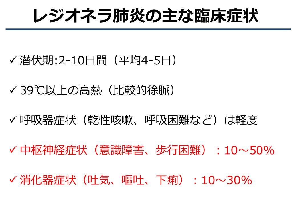 #22. レジオネラ肺炎の主な臨床症状 潜伏期:2-10日間(平均4-5日) 39℃以上の高熱(比較的徐脈) 呼吸器症状(乾性咳嗽、呼吸困難など)は軽度 中枢神経症状(意識障害、歩行困難):10~50% 消化器症状(吐気、嘔吐、下痢):10~30%