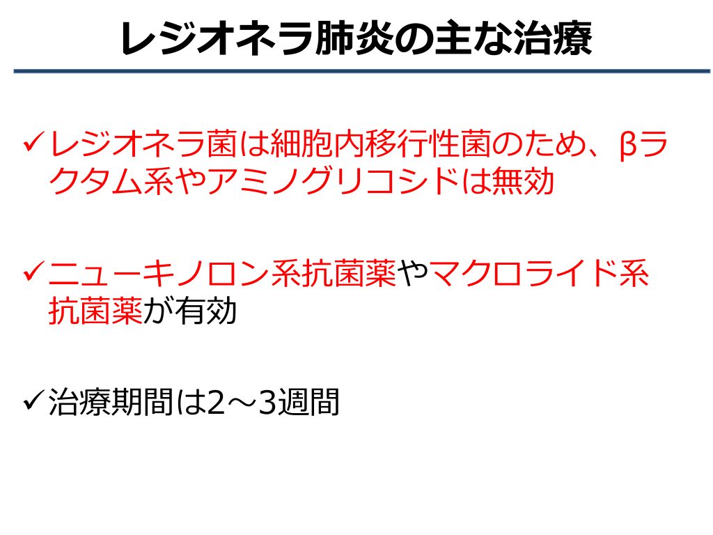 #23. レジオネラ肺炎の主な治療 レジオネラ菌は細胞内移行性菌のため、βラ クタム系やアミノグリコシドは無効 ニューキノロン系抗菌薬やマクロライド系 抗菌薬が有効 治療期間は2~3週間