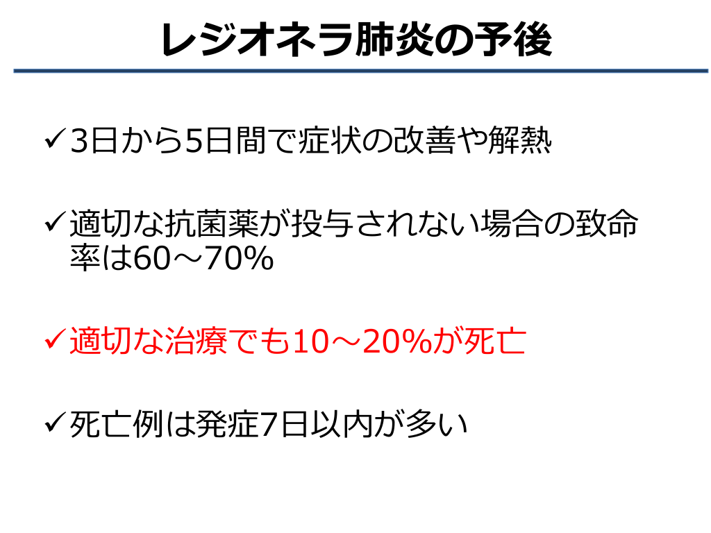 #24. レジオネラ肺炎の予後 3日から5日間で症状の改善や解熱 適切な抗菌薬が投与されない場合の致命 率は60~70% 適切な治療でも10~20%が死亡 死亡例は発症7日以内が多い