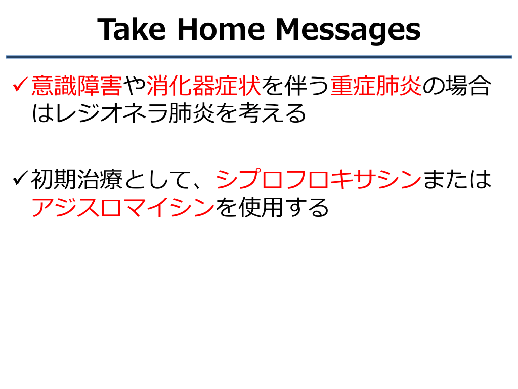 #25. Take Home Messages 意識障害や消化器症状を伴う重症肺炎の場合 はレジオネラ肺炎を考える 初期治療として、シプロフロキサシンまたは アジスロマイシンを使用する