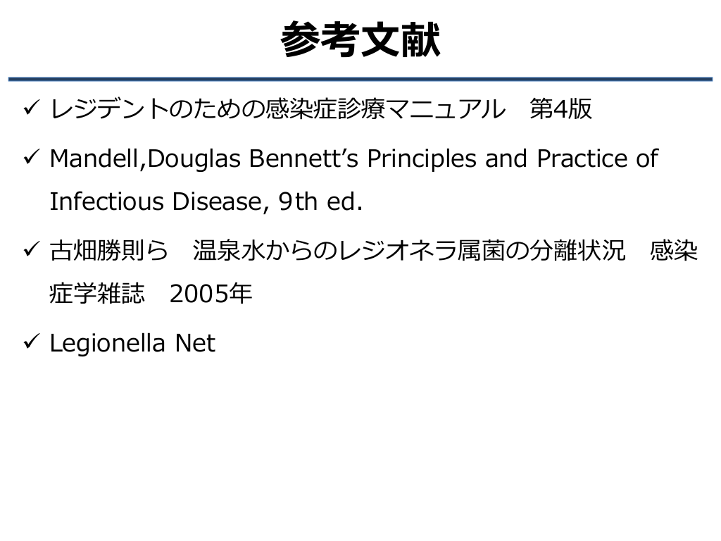 #26. 参考文献 レジデントのための感染症診療マニュアル 第4版 Mandell,Douglas Bennett’s Principles and Practice of Infectious Disease, 9th ed. 古畑勝則ら 症学雑誌 温泉水からのレジオネラ属菌の分離状況 2005年 Legionella Net 感染