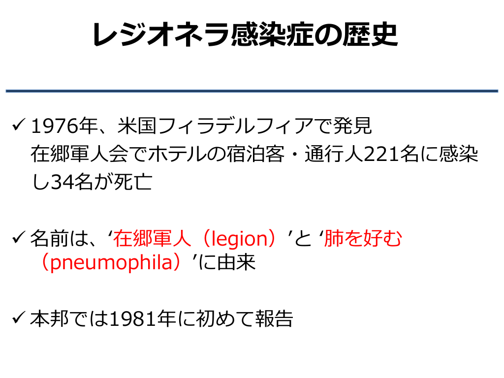 #3. レジオネラ感染症の歴史 1976年、米国フィラデルフィアで発見 在郷軍人会でホテルの宿泊客・通行人221名に感染 し34名が死亡 名前は、‘在郷軍人(legion)’と ‘肺を好む (pneumophila)’に由来 本邦では1981年に初めて報告