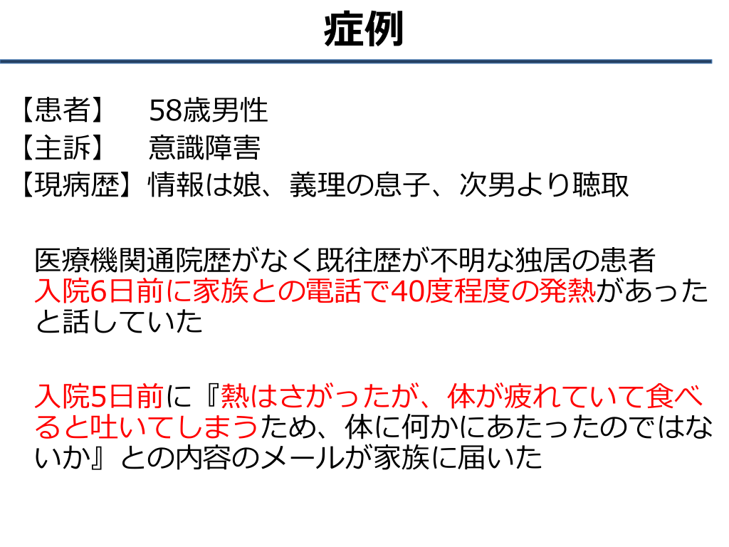 #5. 症例 【患者】 58歳男性 【主訴】 意識障害 【現病歴】情報は娘、義理の息子、次男より聴取 医療機関通院歴がなく既往歴が不明な独居の患者 入院6日前に家族との電話で40度程度の発熱があった と話していた 入院5日前に『熱はさがったが、体が疲れていて食べ ると吐いてしまうため、体に何かにあたったのではな いか』との内容のメールが家族に届いた