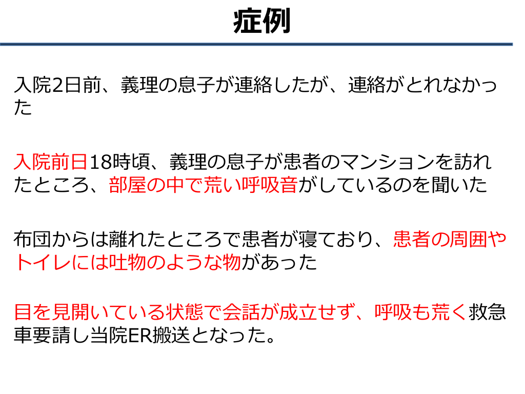 #6. 症例 入院2日前、義理の息子が連絡したが、連絡がとれなかっ た 入院前日18時頃、義理の息子が患者のマンションを訪れ たところ、部屋の中で荒い呼吸音がしているのを聞いた 布団からは離れたところで患者が寝ており、患者の周囲や トイレには吐物のような物があった 目を見開いている状態で会話が成立せず、呼吸も荒く救急 車要請し当院ER搬送となった。