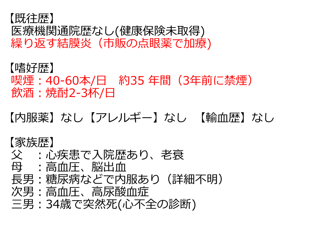 #7. 【既往歴】 医療機関通院歴なし(健康保険未取得) 繰り返す結膜炎(市販の点眼薬で加療) 【嗜好歴】 喫煙:40-60本/日 約35 年間(3年前に禁煙) 飲酒:焼酎2-3杯/日 【内服薬】なし【アレルギー】なし 【輸血歴】なし 【家族歴】 父 :心疾患で入院歴あり、老衰 母 :高血圧、脳出血 長男:糖尿病などで内服あり(詳細不明) 次男:高血圧、高尿酸血症 三男:34歳で突然死(心不全の診断)
