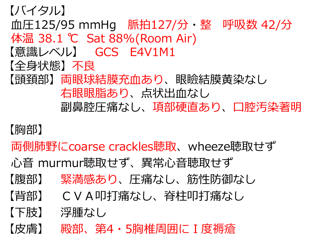 #8. 【バイタル】 血圧125/95 mmHg 脈拍127/分・整 呼吸数 42/分 体温 38.1 ℃ Sat 88%(Room Air) 【意識レベル】 GCS E4V1M1 【全身状態】不良 【頭頚部】両眼球結膜充血あり、眼瞼結膜黄染なし 右眼眼脂あり、点状出血なし 副鼻腔圧痛なし、項部硬直あり、口腔汚染著明 【胸部】 両側肺野にcoarse crackles聴取、wheeze聴取せず 心音 murmur聴取せず、異常心音聴取せず 【腹部】 緊満感あり、圧痛なし、筋性防御なし 【背部】 CVA叩打痛なし、脊柱叩打痛なし 【下肢】 浮腫なし 【皮膚】 殿部、第4・5胸椎周囲にⅠ度褥瘡