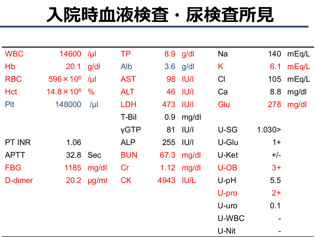 #9. 入院時血液検査・尿検査所見 WBC Hb 14600 /μl 20.1 g/dl TP 8.9 g/dl Na 140 mEq/L Alb 3.6 g/dl K 6.1 mEq/L RBC 596×106 /μl AST 98 IU/l Cl 105 mEq/L Hct 14.8×106 % ALT 46 IU/l Ca 8.8 mg/dl Plt 148000 LDH 473 IU/l Glu 278 mg/dl T-Bil 0.9 mg/dl γGTP 81 IU/l U-SG 1.030> /μl PT INR 1.06 ALP 255 IU/l U-Glu 1+ APTT 32.8 Sec BUN 67.3 mg/dl U-Ket +/- FBG 1185 mg/dl Cr 1.12 mg/dl U-OB 3+ D-dimer 20.2 μg/ml CK 4943 IU/L U-pH 5.5 U-pro 2+ U-uro 0.1 U-WBC - U-Nit -