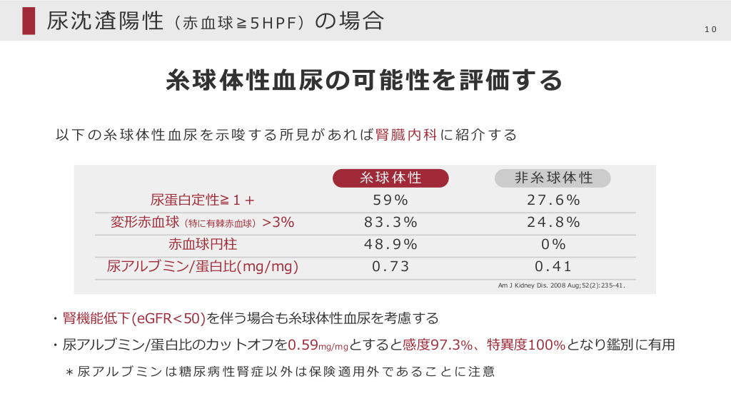 #10. 尿沈渣陽性(⾚⾎球≧5HPF)の場合 10 ⽷球体性⾎尿の可能性を評価する 以下の⽷球体性⾎尿を⽰唆する所⾒があれば腎臓内科に紹介する ⽷球体性 ⾮⽷球体性 尿蛋⽩定性≧1+ 59% 27.6% 変形⾚⾎球(特に有棘⾚⾎球)>3% 83.3% 24.8% ⾚⾎球円柱 48.9% 0% 尿アルブミン/蛋⽩⽐(mg/mg) 0.73 0.41 Am J Kidney Dis. 2008 Aug;52(2):235-41. ・腎機能低下(eGFR<50)を伴う場合も⽷球体性⾎尿を考慮する ・尿アルブミン/蛋⽩⽐のカットオフを0.59mg/mgとすると感度97.3%、特異度100%となり鑑別に有⽤ *尿アルブミンは糖尿病性腎症以外は保険適⽤外であることに注意