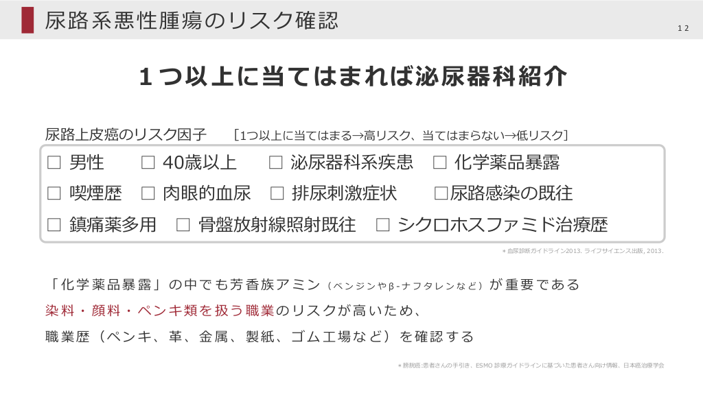 #12. 尿路系悪性腫瘍のリスク確認 12 1つ以上に当てはまれば泌尿器科紹介 尿路上⽪癌のリスク因⼦ [1つ以上に当てはまる→⾼リスク、当てはまらない→低リスク] □ 男性 □ 40歳以上 □ 泌尿器科系疾患 □ 化学薬品暴露 □ 喫煙歴 □ ⾁眼的⾎尿 □ 排尿刺激症状 □ 鎮痛薬多⽤ □ ⾻盤放射線照射既往 □尿路感染の既往 □ シクロホスファミド治療歴 *⾎尿診断ガイドライン2013. ライフサイエンス出版, 2013. 「化学薬品暴露」の中でも芳⾹族アミン(ベンジンやβ-ナフタレンなど)が重要である 染料・顔料・ペンキ類を扱う職業のリスクが⾼いため、 職業歴(ペンキ、⾰、⾦属、製紙、ゴム⼯場など)を確認する *膀胱癌:患者さんの⼿引き、ESMO 診療ガイドラインに基づいた患者さん向け情報、⽇本癌治療学会