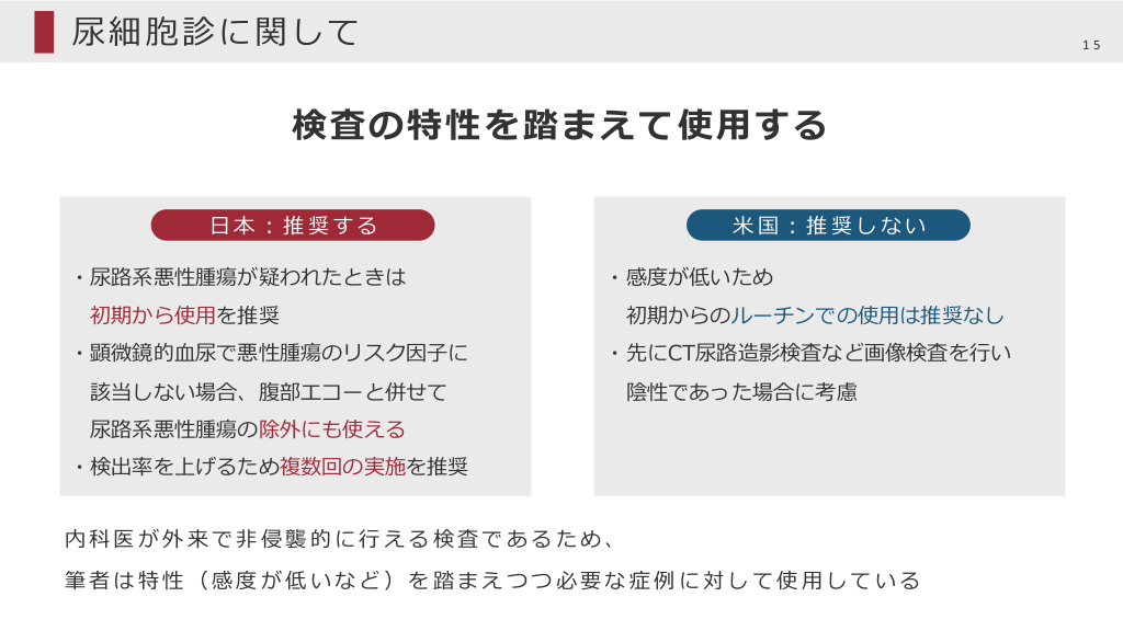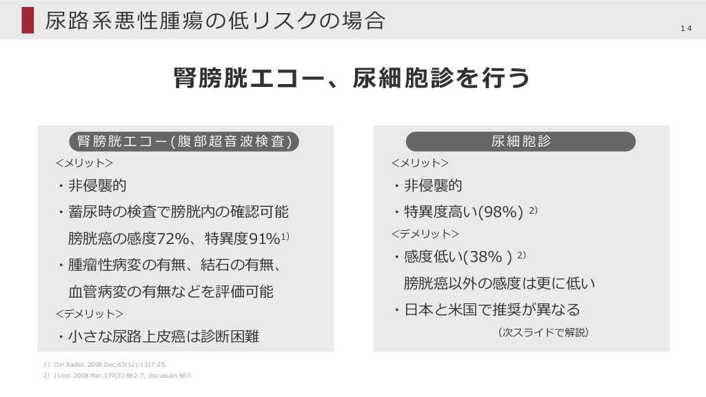 #14. 尿路系悪性腫瘍の低リスクの場合 14 腎膀胱エコー、尿細胞診を⾏う 腎膀胱エコー(腹部超⾳波検査) 尿細胞診 <メリット> <メリット> ・⾮侵襲的 ・⾮侵襲的 ・蓄尿時の検査で膀胱内の確認可能 ・特異度⾼い(98%) 膀胱癌の感度72%、特異度91%1) ・腫瘤性病変の有無、結⽯の有無、 ⾎管病変の有無などを評価可能 <デメリット> ・⼩さな尿路上⽪癌は診断困難 1)Clin Radiol. 2008 Dec;63(12):1317-25. 2)J Urol. 2008 Mar;179(3):862-7; discussion 867. 2) <デメリット> ・感度低い(38% ) 2) 膀胱癌以外の感度は更に低い ・⽇本と⽶国で推奨が異なる (次スライドで解説)
