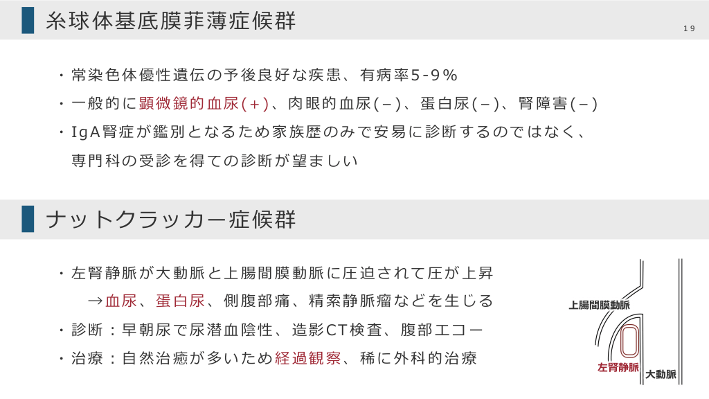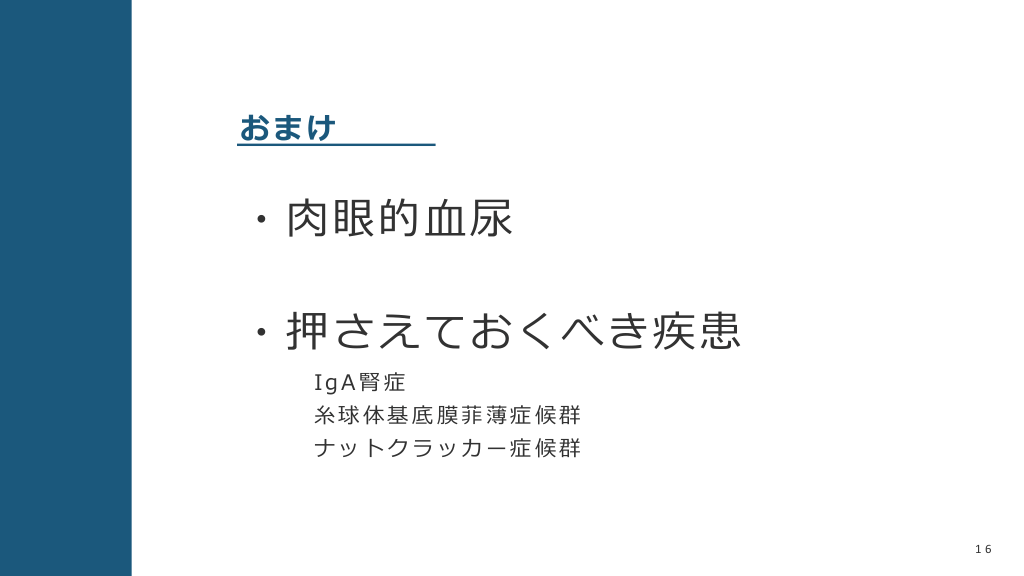 #16. おまけ ・⾁眼的⾎尿 ・押さえておくべき疾患 IgA腎症 ⽷球体基底膜菲薄症候群 ナットクラッカー症候群 16